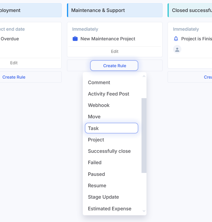 4. Add the condition that must be met for your rule to continue running. For instance, the task should be created only if the project amount is more than $5.000. To create a condition, select a project field and custom values for the condition.