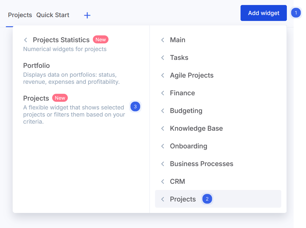 - En la categoría Proyectos (2) a la derecha, selecciona el widget Proyectos (3) de la lista de la izquierda.