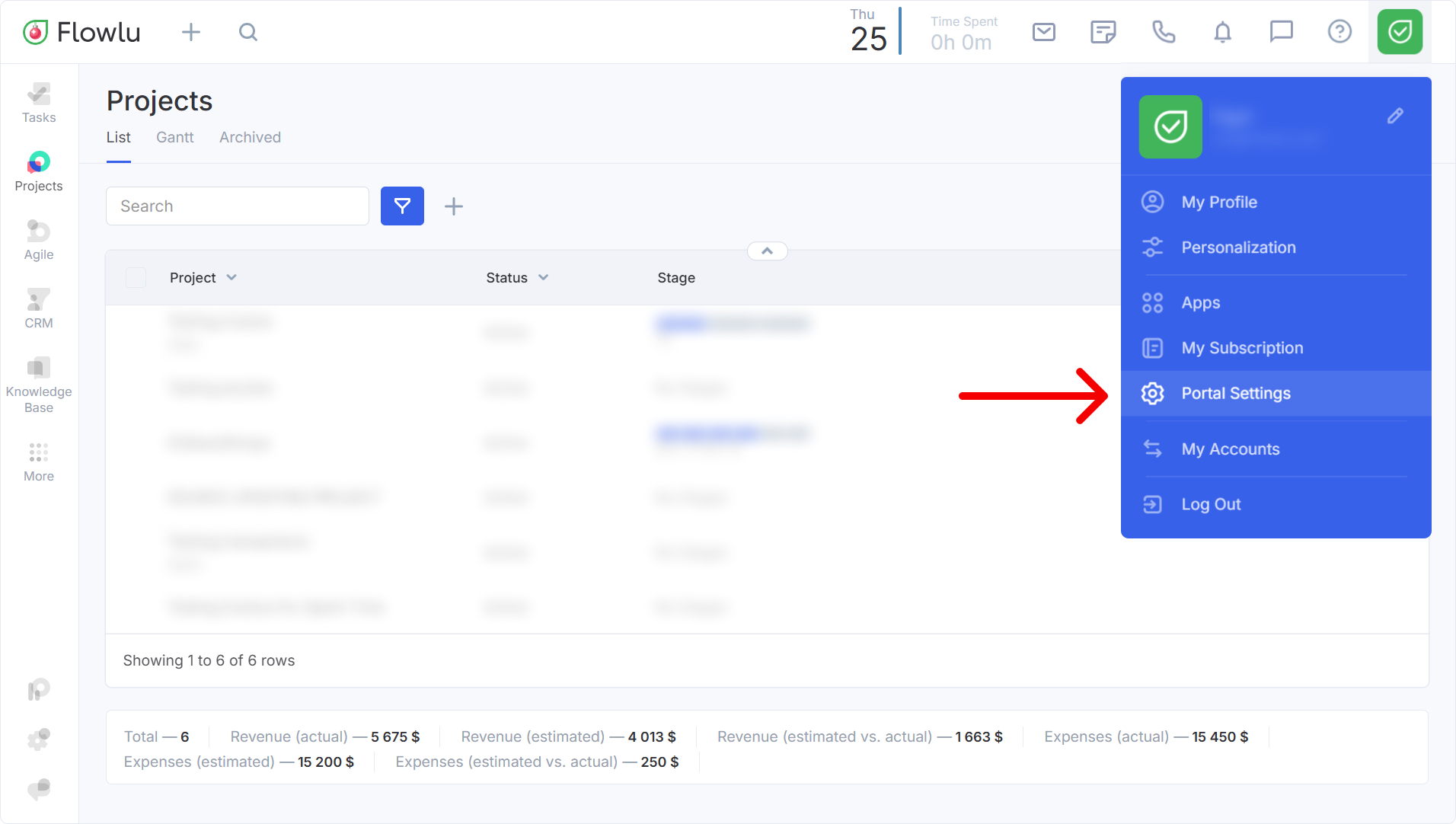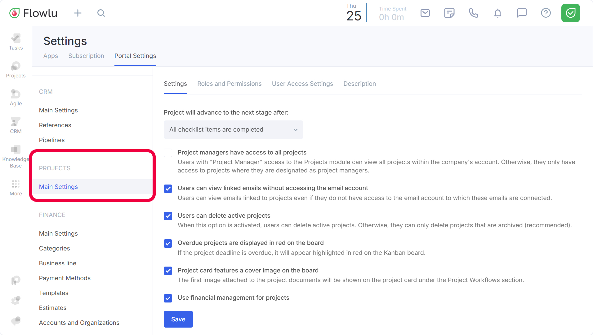Pase el cursor sobre el módulo "Proyectos" en el menú lateral. En la pestaña que aparece, haga clic en "Ajustes".