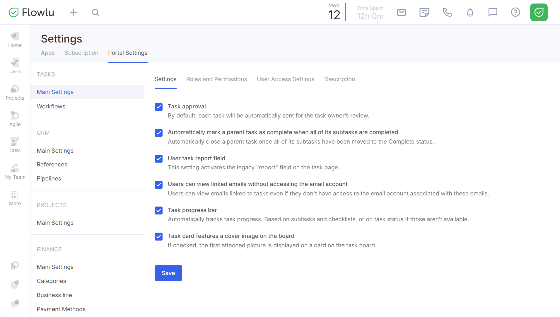 La configuración está disponible para los administradores del módulo Tareas. Puede acceder a ella de varias maneras desde diferentes secciones del sistema.