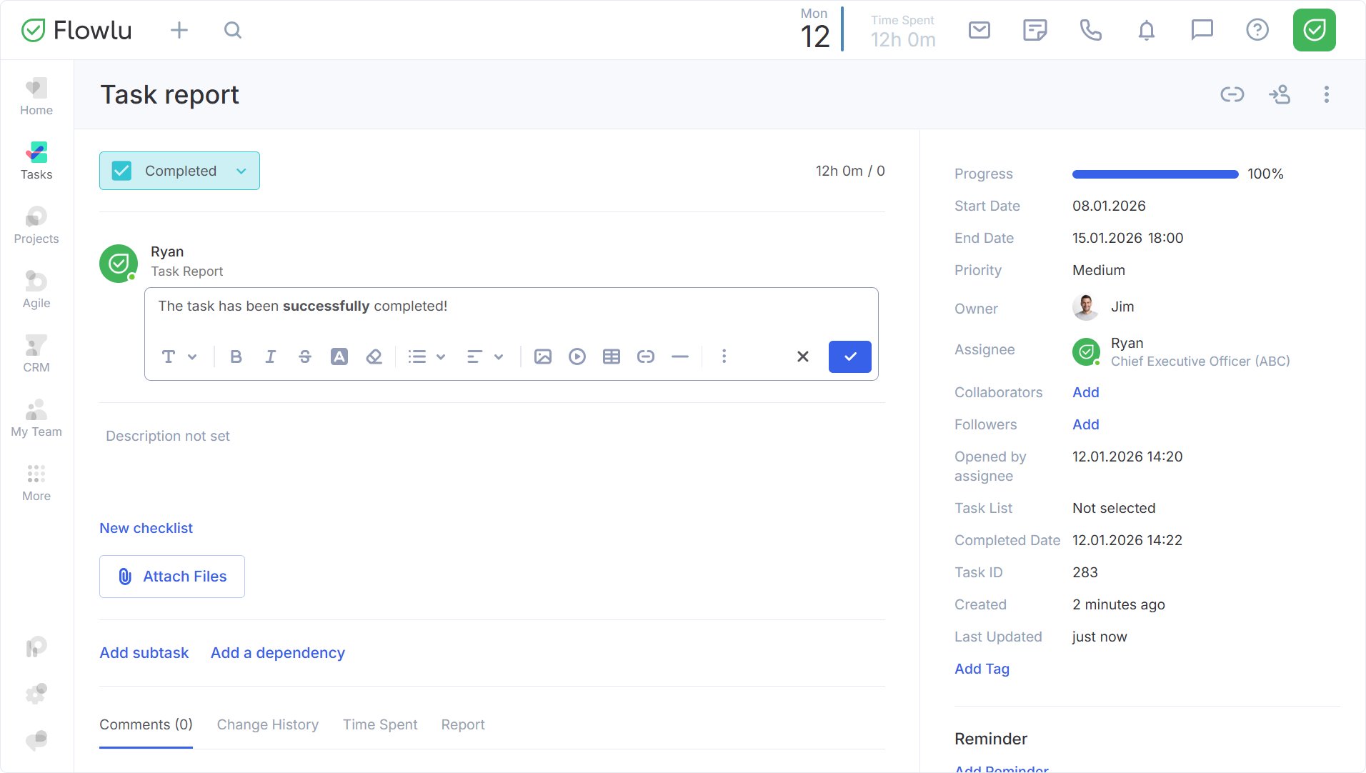 Si la opción está activa, el campo aparece automáticamente al mover la tarea a la etapa Finalizado. En él, el Responsable y los Colaboradores pueden, por ejemplo, resumir los resultados del trabajo o compartir un enlace.