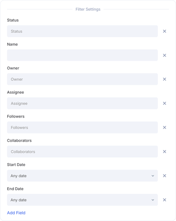 - Campos personalizados: Utilice el botón Agregar campo para filtrar por cualquier otro parámetro de tarea disponible.