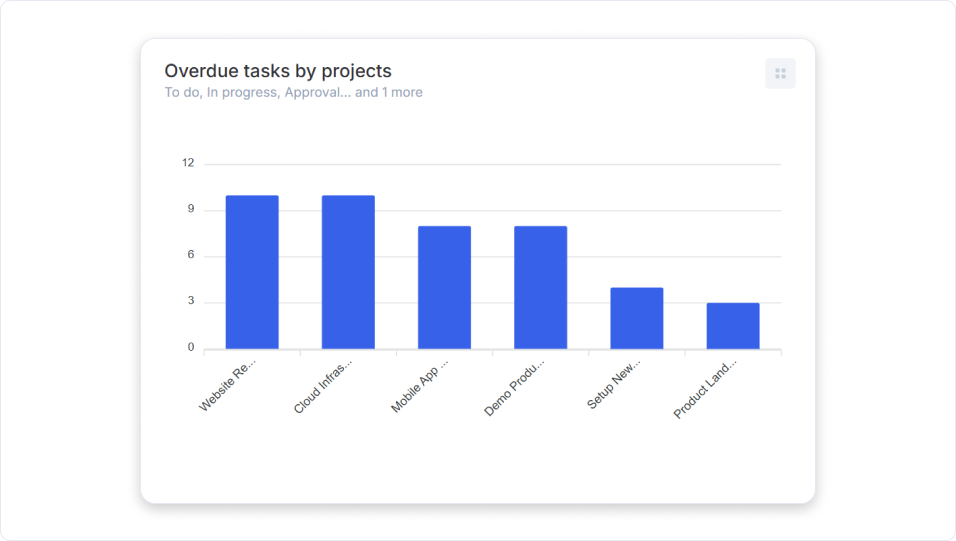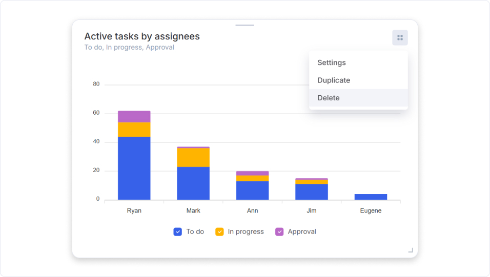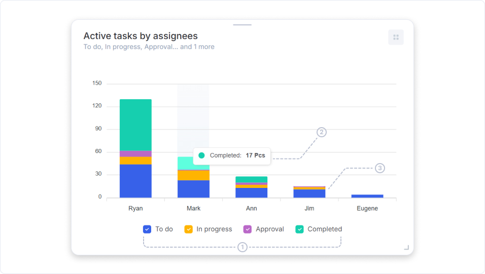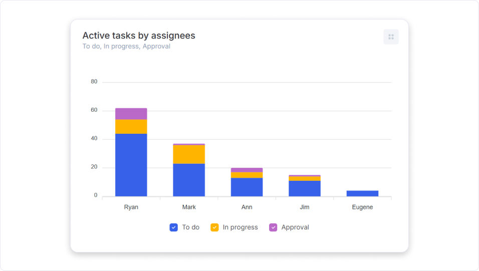 Se trata de un widget flexible que le permite visualizar los datos de las tareas en formato de gráfico de columnas. Es ideal para comparar métricas clave, como la carga de trabajo del equipo o los estados de las tareas en los proyectos, y para detectar cuellos de botella en su flujo de trabajo.