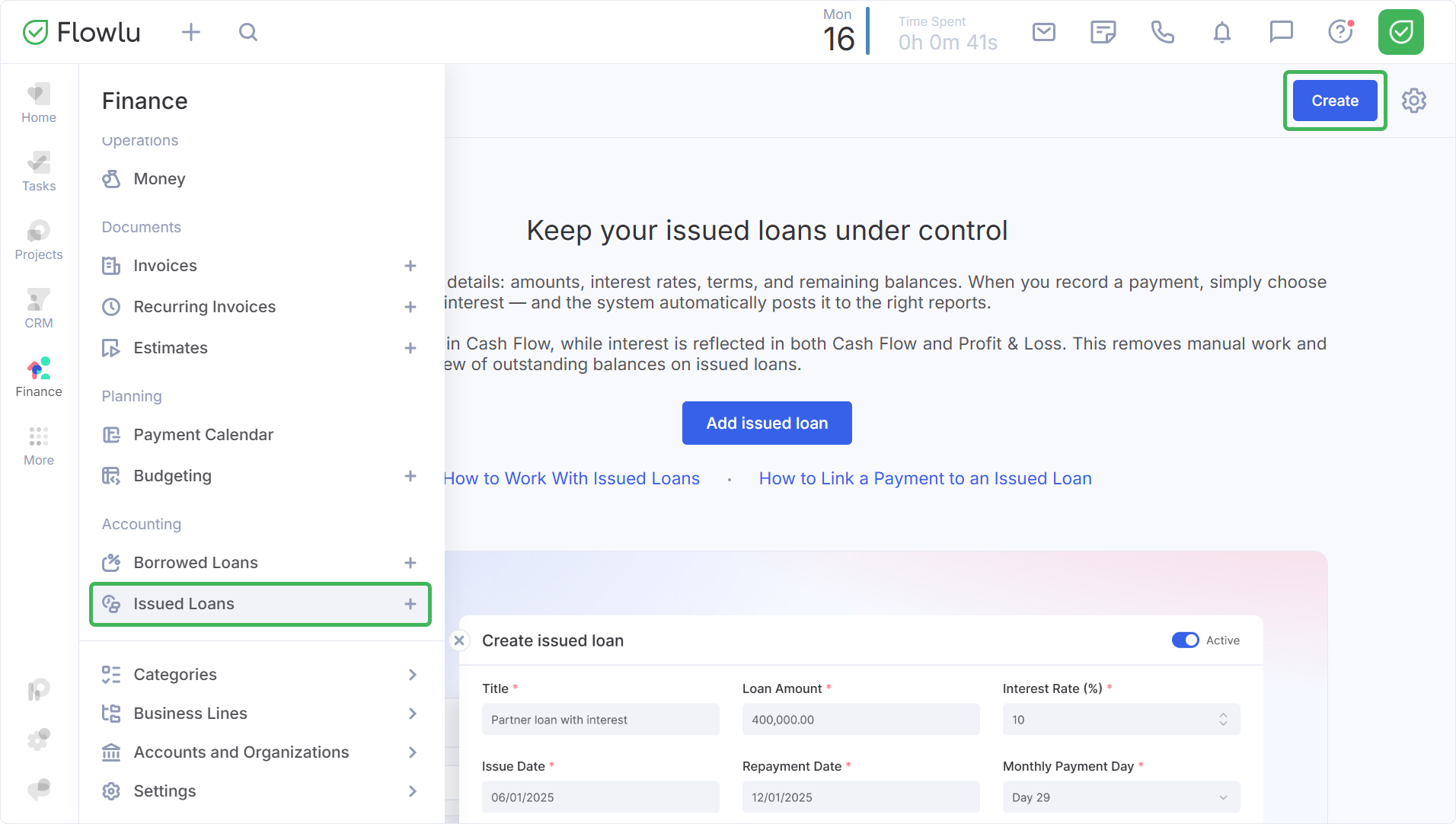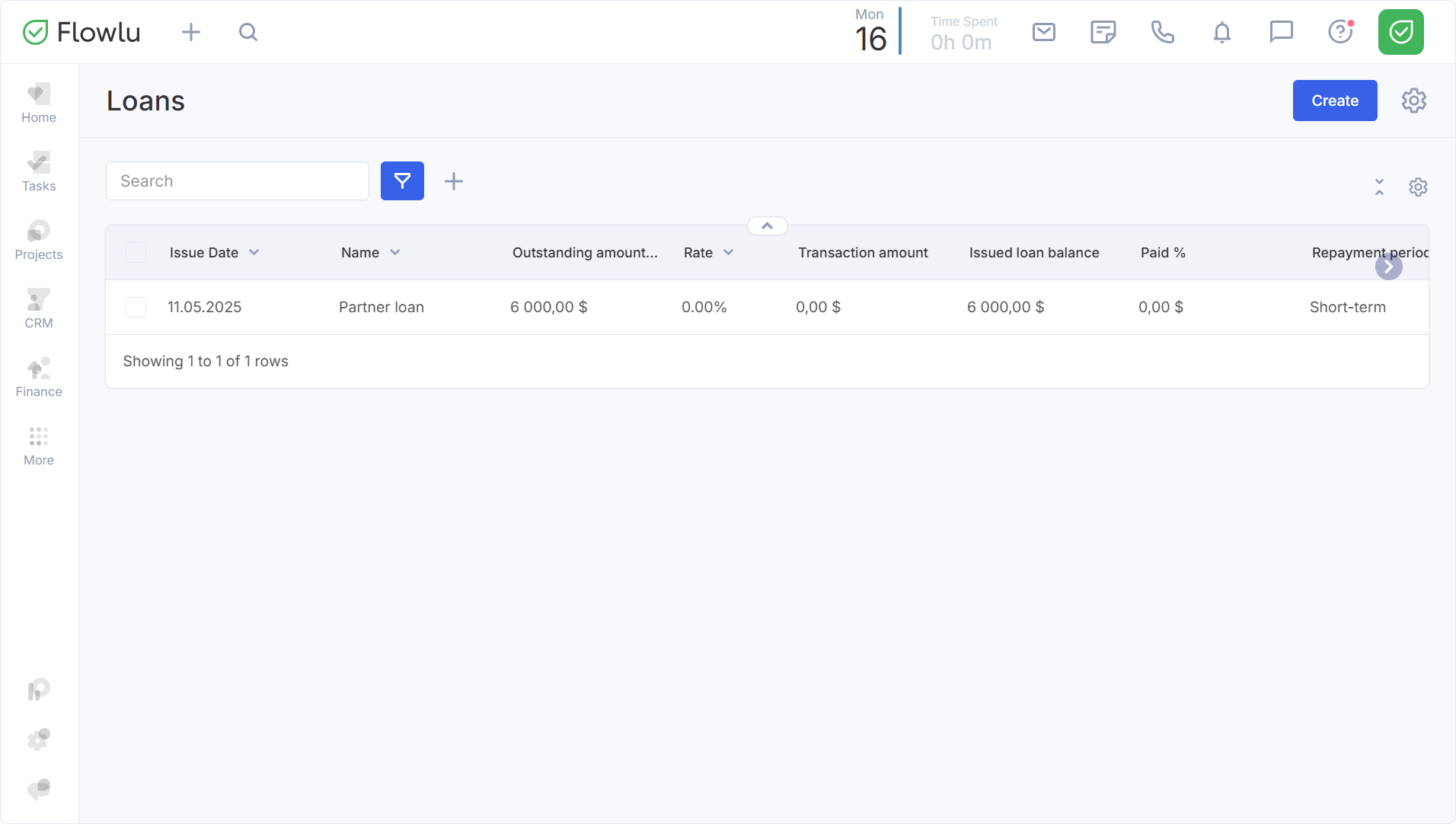 Para crear un registro de préstamo otorgado a través del menú del módulo Finanzas, diríjase a la subsección Préstamos otorgados y haga clic en el botón Crear.