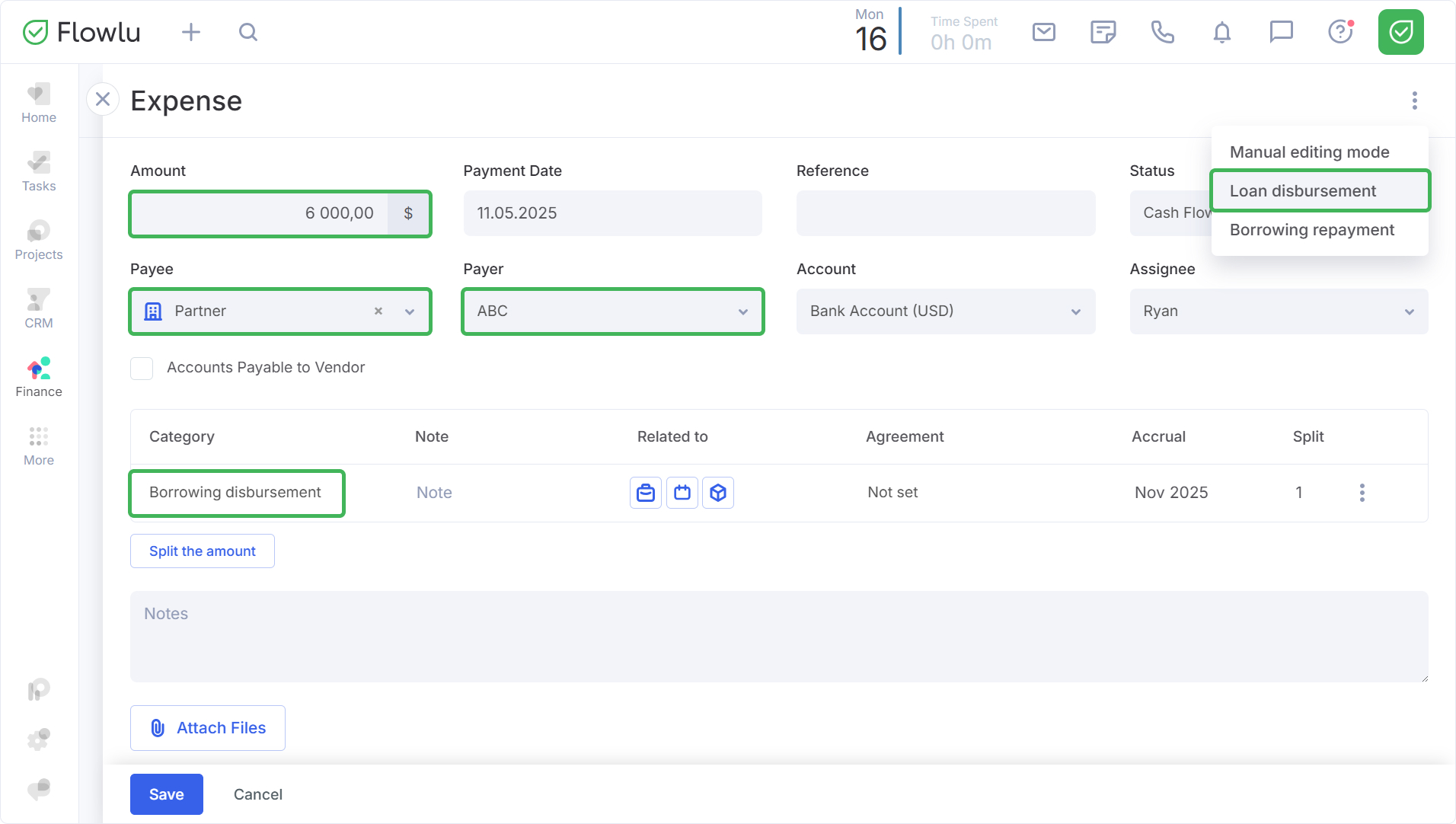 A continuación, este gasto debe vincularse a la entidad en el módulo de Préstamos y Financiamientos . Para ello, en la ventana de edición del gasto, abra el menú contextual y seleccione la opción "Otorgamiento del préstamo".
