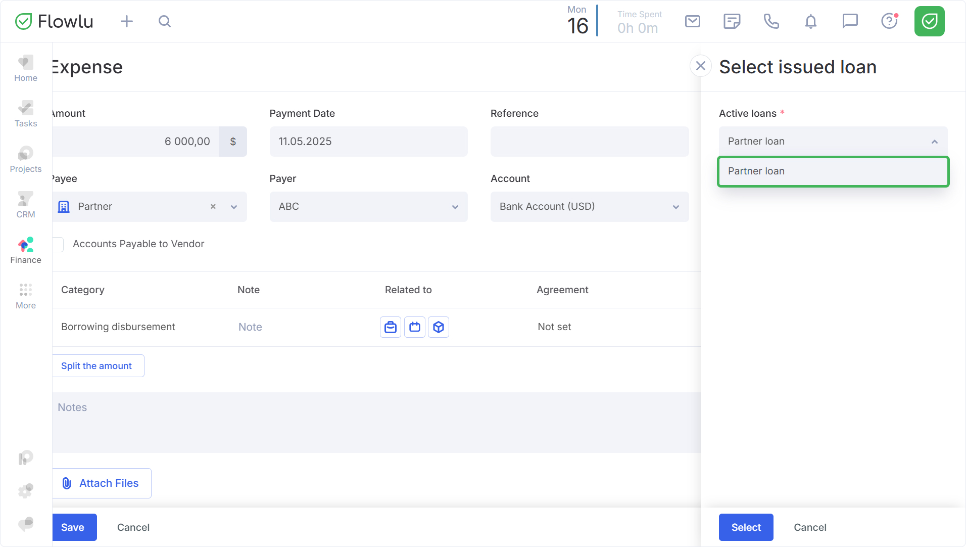 Importante: Para vincular el préstamo correcto, las organizaciones en la entrada de gasto y en la ficha del préstamo deben coincidir.
