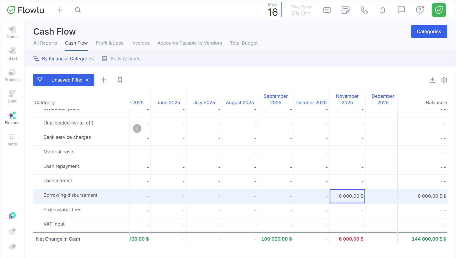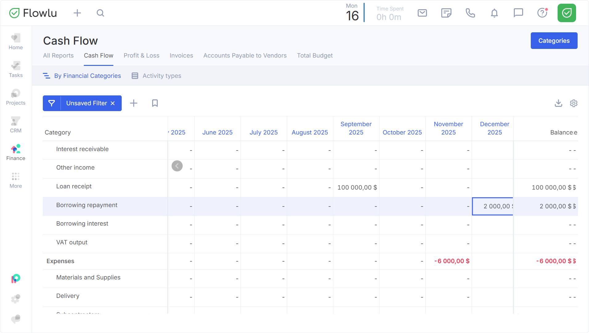 Las entradas por la amortización del préstamo y los intereses (si los hay) se mostrarán en las categorías correspondientes en los informes de Flujo de Caja y de Pérdidas y Ganancias (P&L).