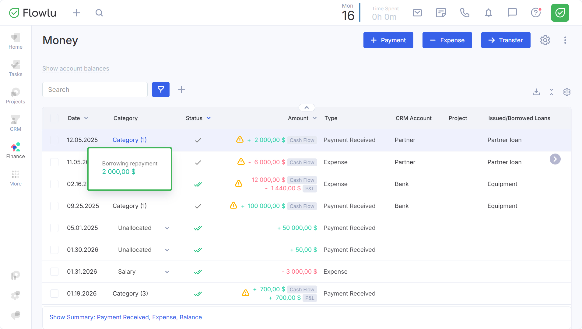 Los reembolsos de los préstamos otorgados también deben contabilizarse en la sección Dinero. Para ello, cree una entrada de Pago. En el formulario, complete los campos y asegúrese de especificar:
