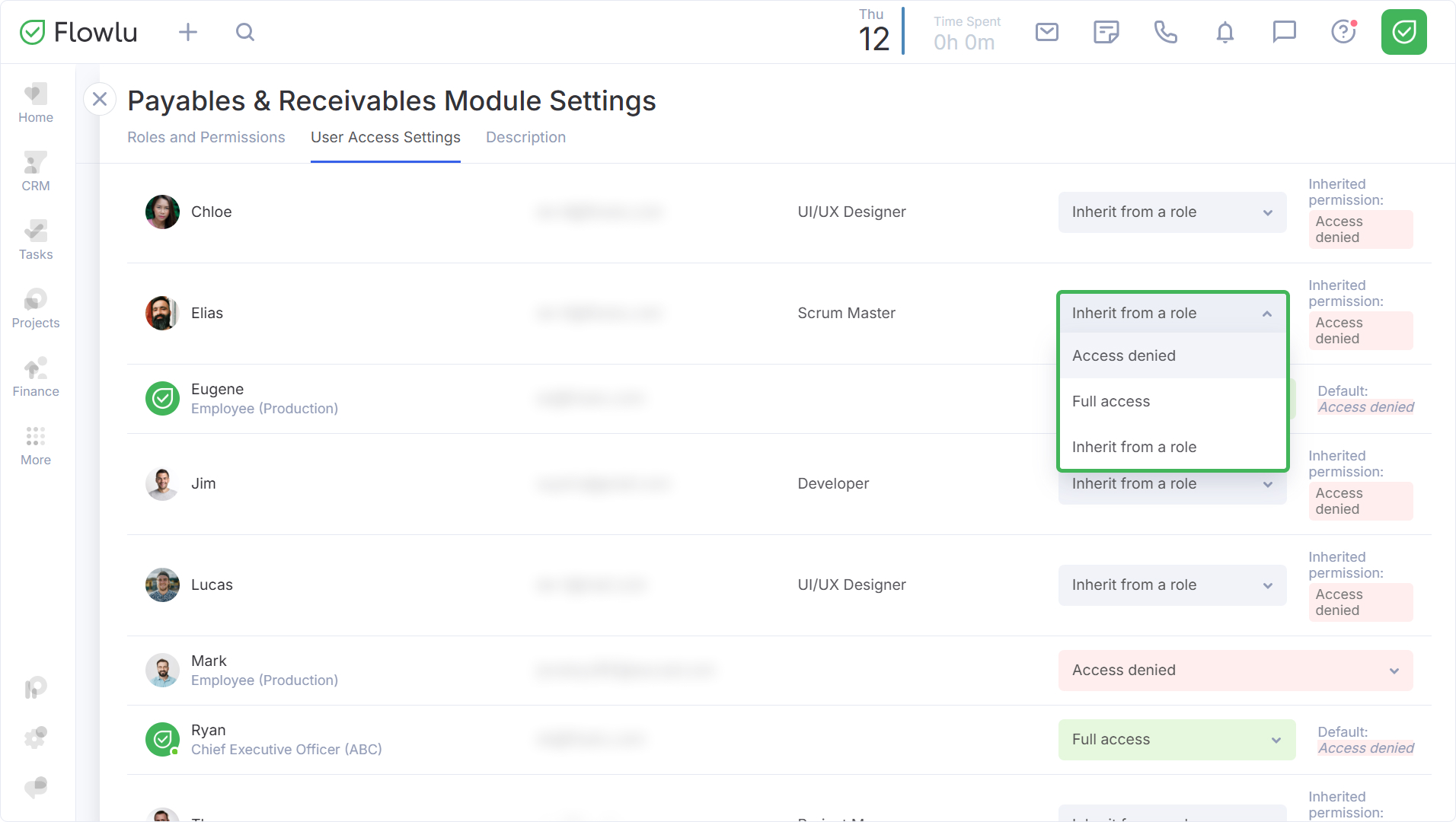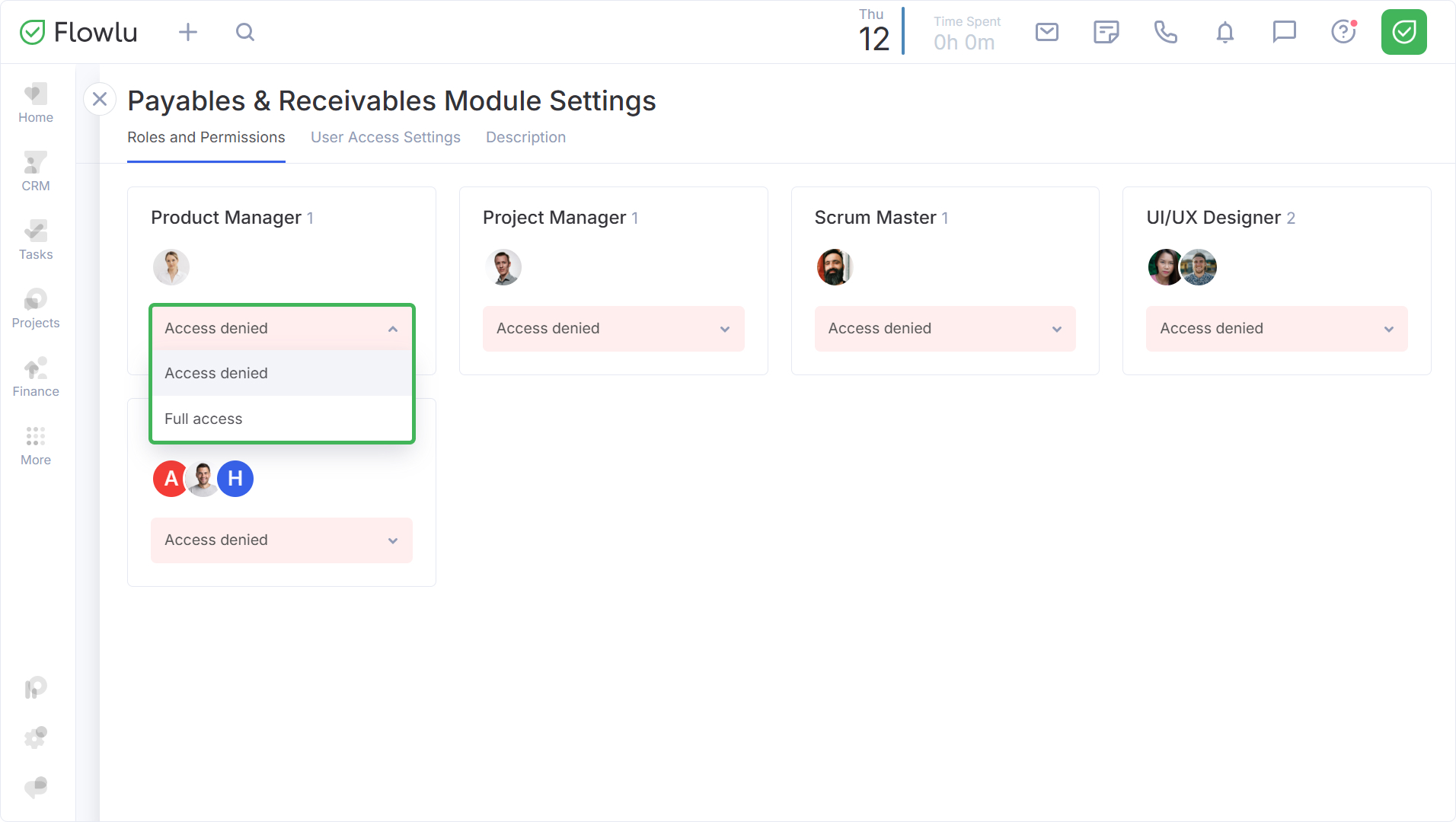 Si desea cambiar los permisos para todo un grupo de usuarios a la vez, vaya a la pestaña Cargos y permisos, seleccione el rol deseado y utilice la lista desplegable para establecer su nivel de acceso. Esta configuración se aplicará a todos los usuarios de ese rol.