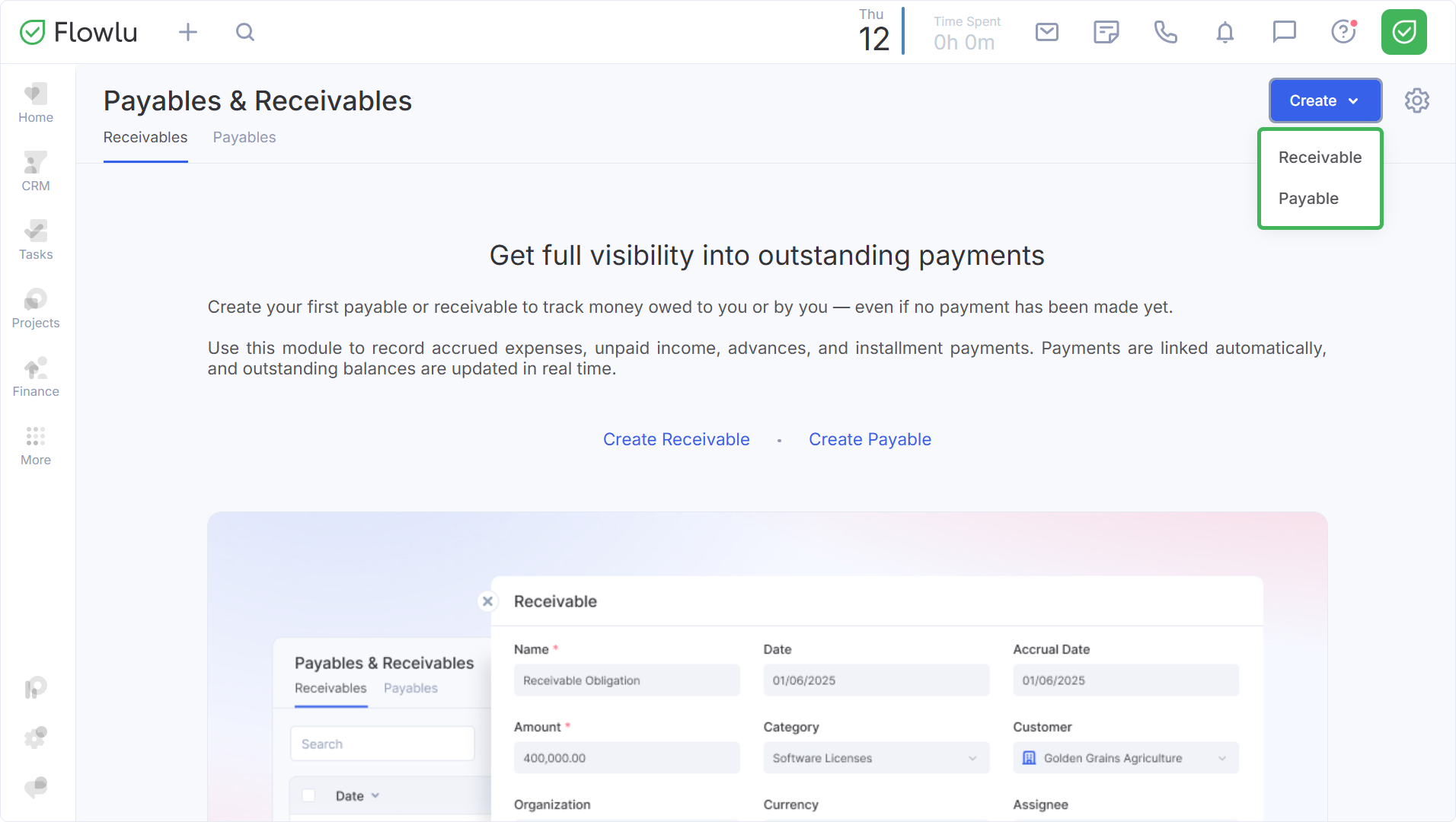 Solo puede añadir entidades dentro del módulo. Para crear una, haga clic en el botón correspondiente en la esquina superior derecha de la pantalla y seleccione el tipo que desea añadir: Cuenta por cobrar o Cuenta por pagar.