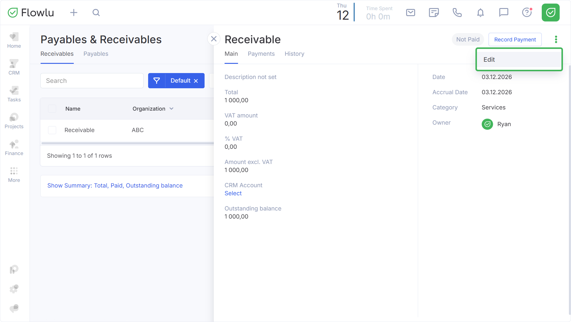 Para cambiar la información de una obligación, diríjase a su ficha, abra el menú contextual en la esquina superior derecha y seleccione Editar.