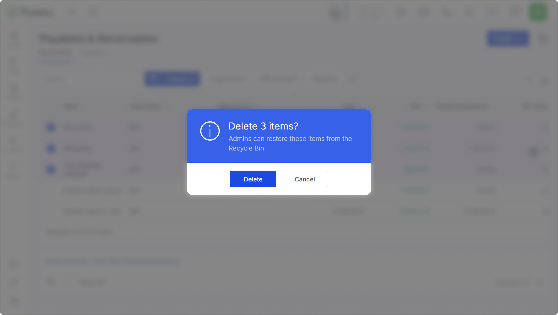 Puede eliminar una o varias obligaciones desde la lista en el módulo Cuentas por Pagar y por Cobrar. Para ello, simplemente seleccione las casillas de verificación correspondientes a las obligaciones que desea eliminar y haga clic en el icono Eliminar que aparece abajo.