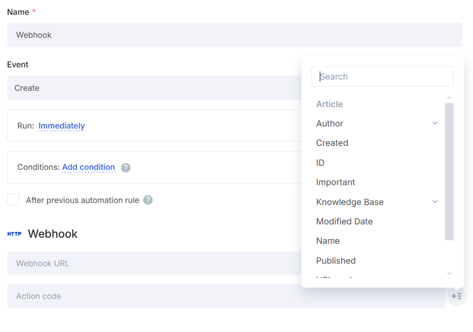 7. Agrega la URL del webhook y el código de acción. Haciendo clic en el botón de tres puntos, puedes agregar variables desde una base de conocimientos.