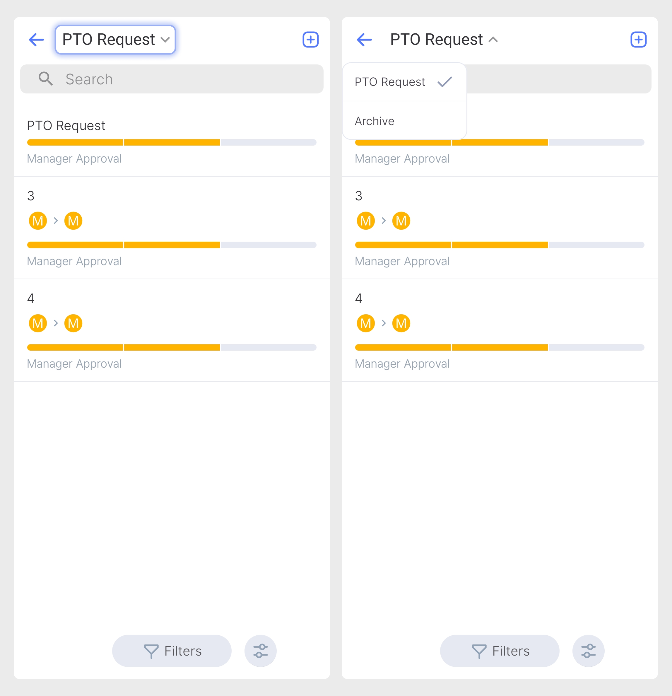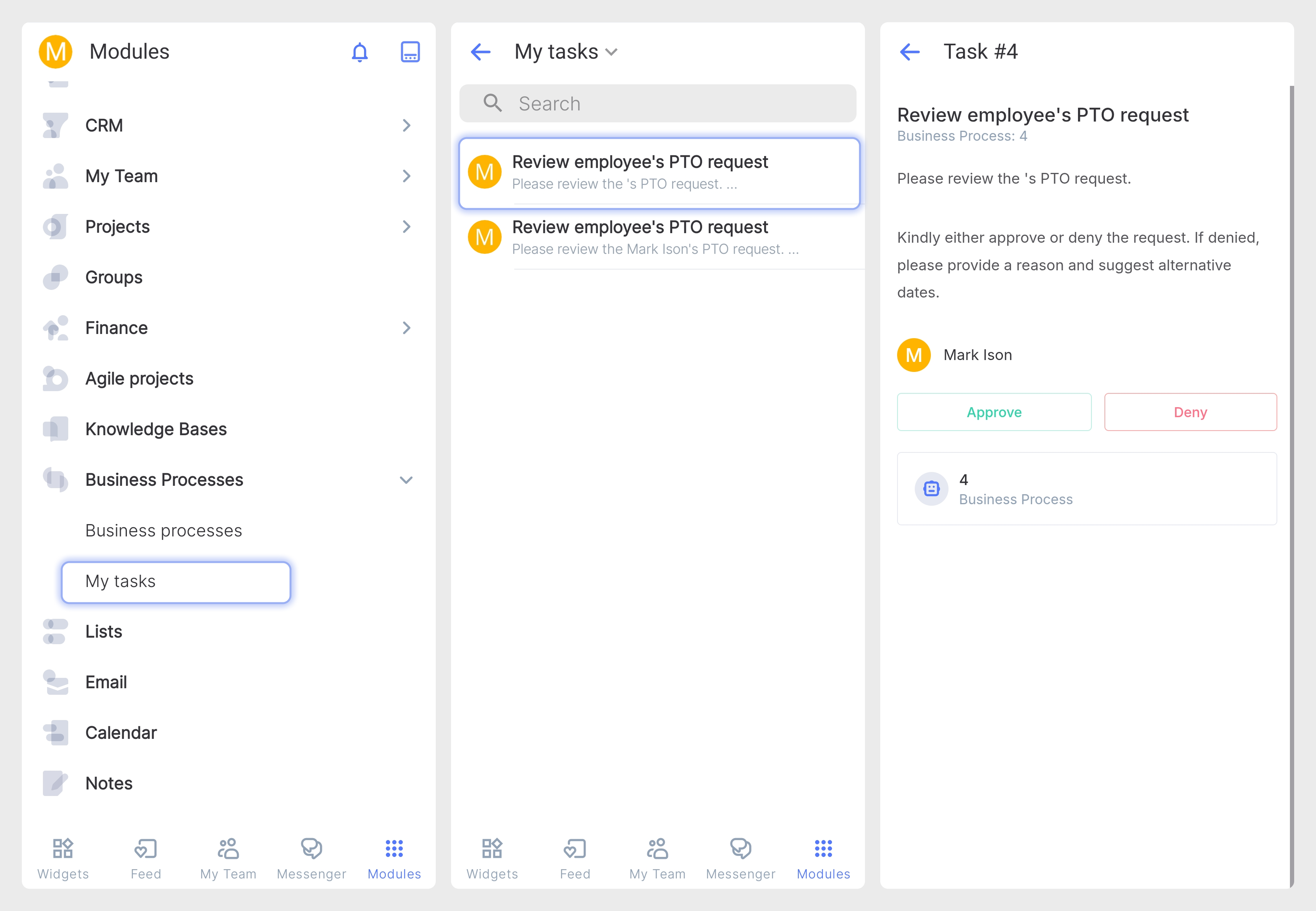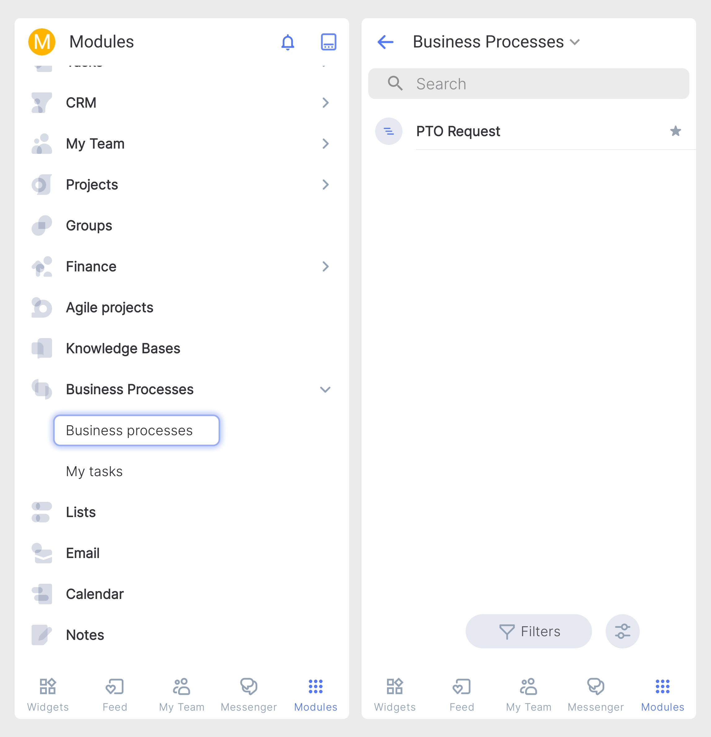 El módulo de Procesos de Negocio en la aplicación móvil de Flowlu le permite participar y gestionar flujos de trabajo estructurados y automatizados desde cualquier lugar. Está diseñado para agilizar operaciones de varios pasos, como aprobaciones, solicitudes e incorporación de personal, garantizando que las tareas pasen de un empleado a otro sin que nada se pierda.