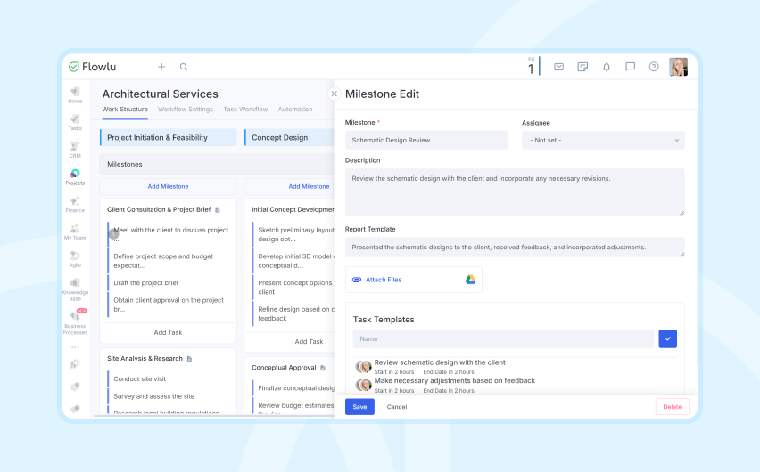 Ya sea diseñando un espacio residencial o comercial, nuestra plantilla proporciona un marco estructurado para mantener sus planes en el cronograma. Flowlu apoya a los arquitectos en el cumplimiento de plazos, fomentando la colaboración y entregando resultados excepcionales con confianza.