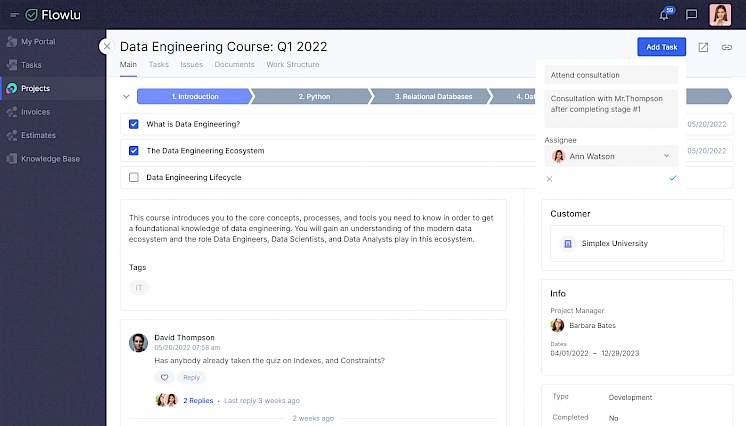 Con Flowlu, puedes construir un centro digital seguro para la colaboración con tus clientes e intercambio de información relevante. Chatea con tus clientes en tiempo real, asigna tareas, muestra el progreso del proyecto, comparte las preguntas frecuentes y las pautas de la empresa, factura a tus clientes y permite que paguen en línea desde la interfaz del portal. Configura permisos flexibles y personaliza cómo se ve tu portal agregando un logotipo, colores de marca y un banner