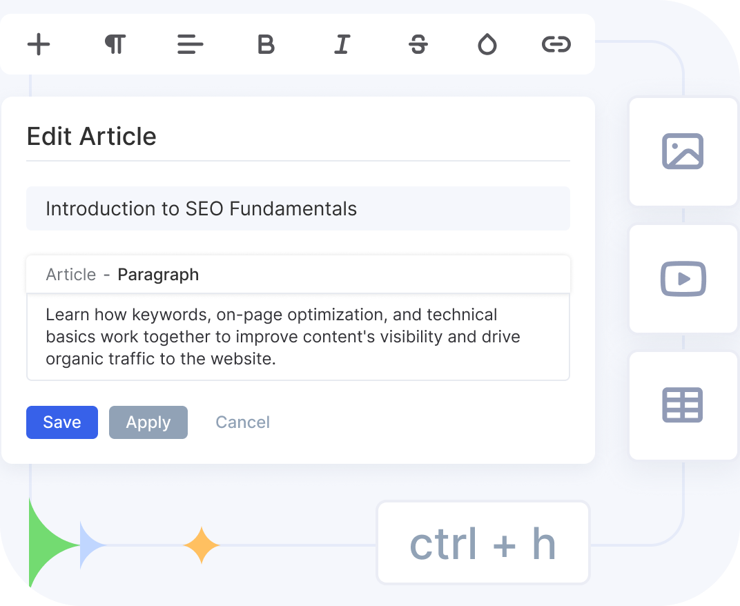 Puede crear y editar nativamente presupuestos, facturas y artículos de la base de conocimiento en Flowlu. Para archivos de oficina estándar (Word, Excel), puede gestionarlos a través de la integración con Google Drive.