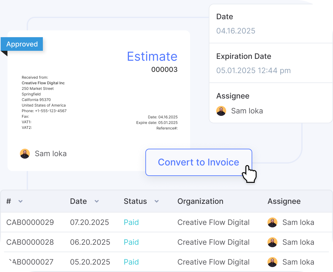 Flowlu simplifica la colaboración tratando las facturas y presupuestos como documentos colaborativos que pueden vincularse a sus oportunidades y proyectos. Puede discutir precios, adjuntar archivos y aprobar contenidos en una sola vista sin cambiar de aplicación.