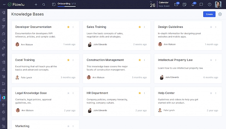 Utilice Flowlu para crear una base de conocimientos de la empresa con todos sus datos importantes. Introdúcelo todo, desde la información financiera hasta las notas sobre los clientes y los clientes potenciales que aún necesitan seguimiento. Tenlo todo disponible desde la misma interfaz basada en la nube 24/7.