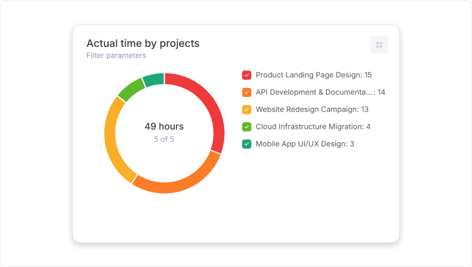 - Data type — choose what the widget will calculate: quantity (number of tasks), spent time, or estimated time.