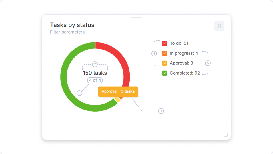 Displays the distribution of all tasks by their global statuses — "To do," "In progress," "Approval," "Completed".
