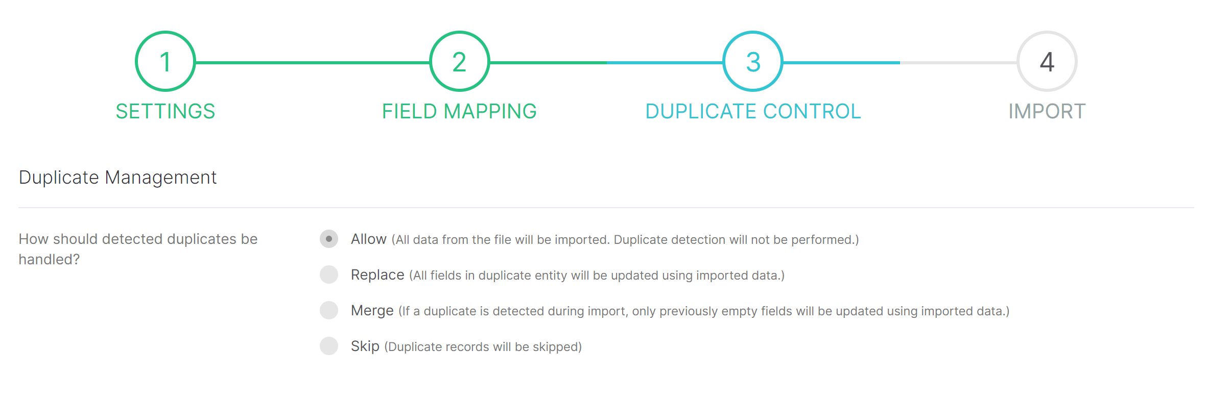- Allow (All data will be imported without duplicates);