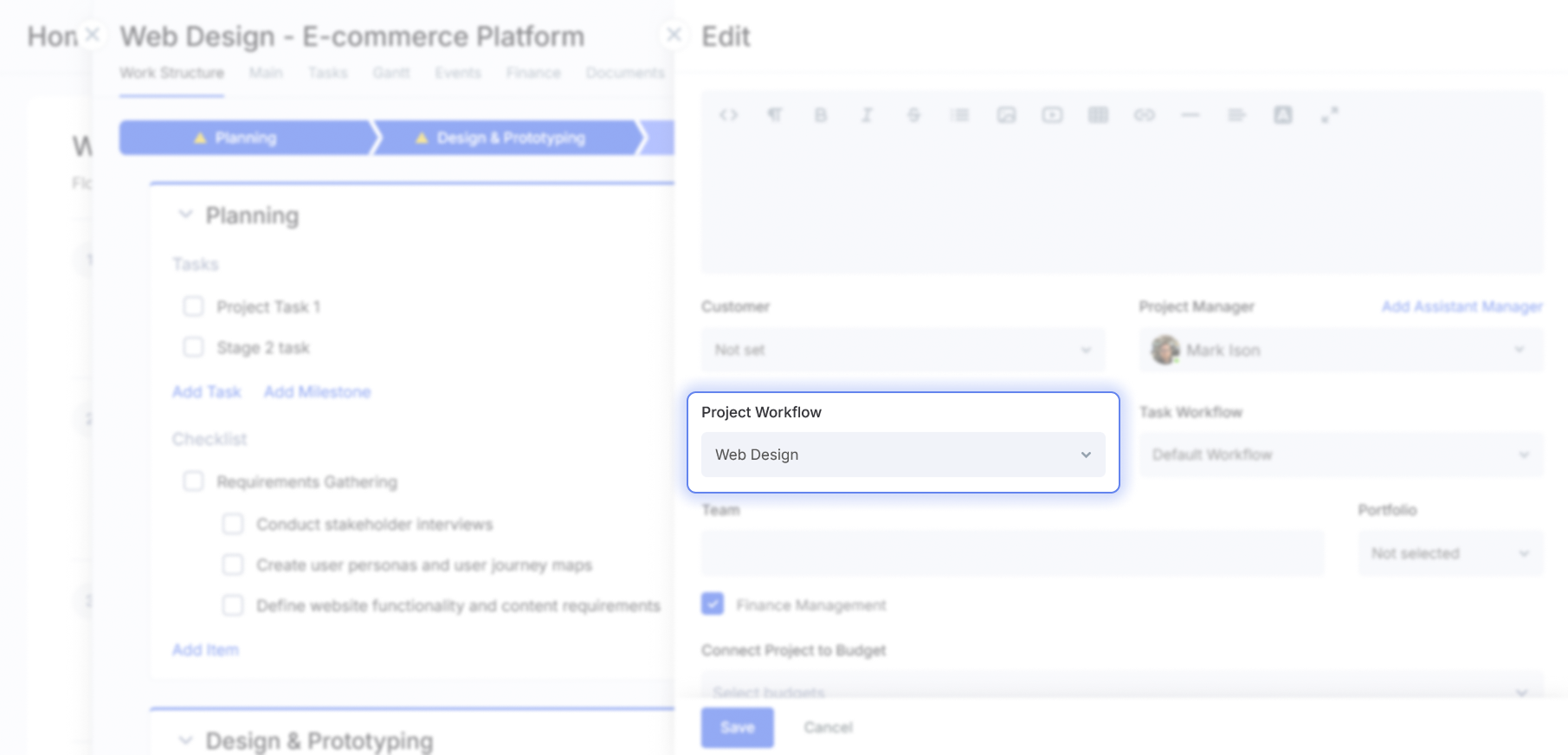 Project workflows are designed to streamline and accelerate the creation of new projects. This is especially valuable for companies that frequently manage standardized, repeatable projects.