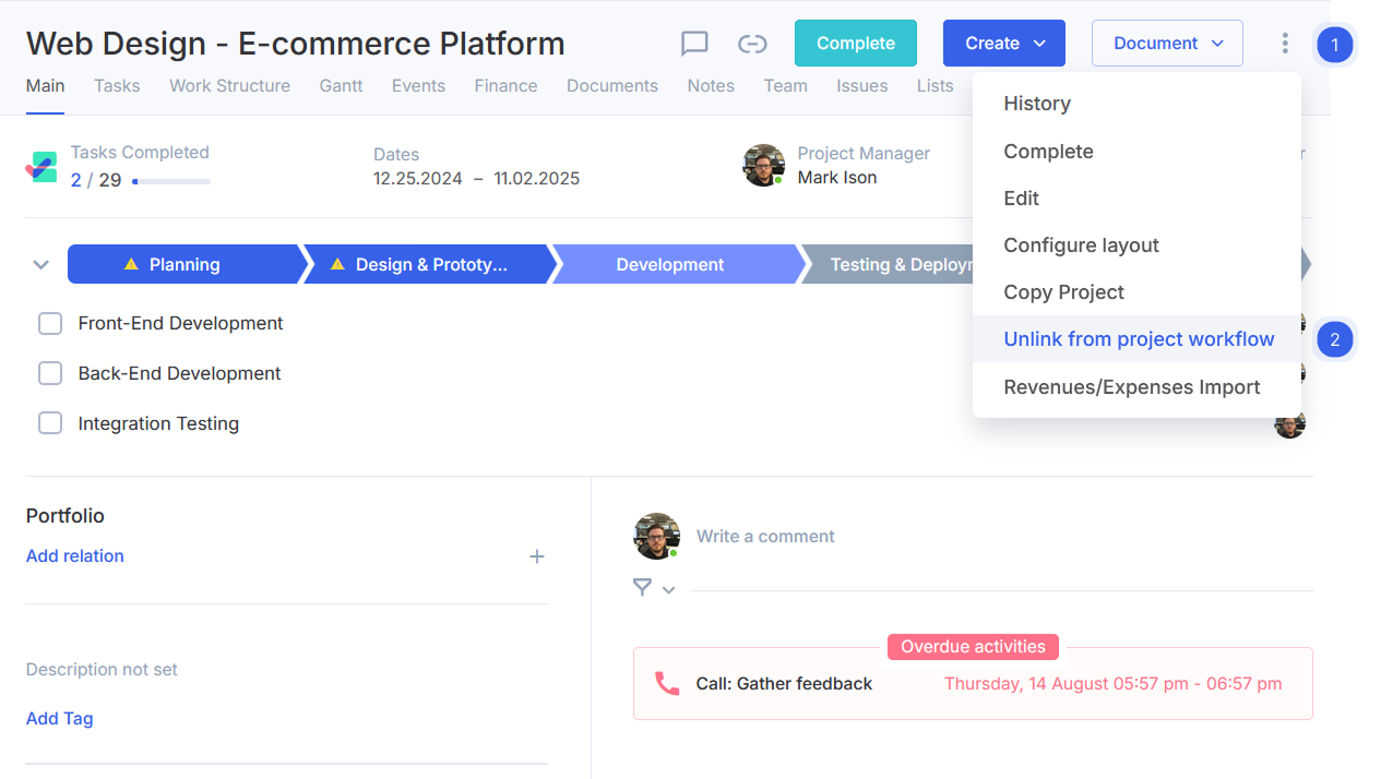 - From the project's main page, click the three-dot menu in the upper-right corner and select the "Unlink from project workflow" option.