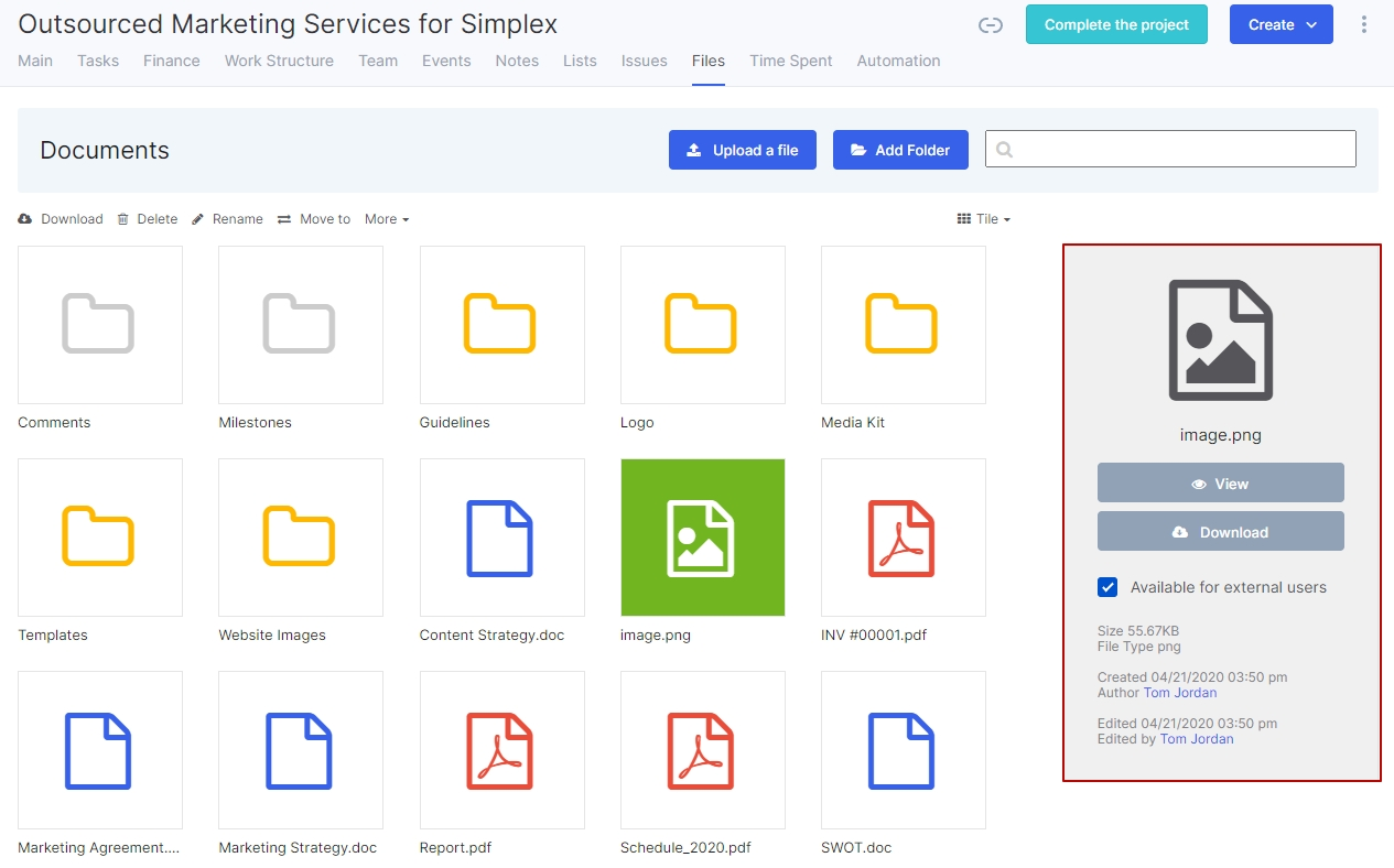 Each team member can view project documents as well as add his own. For convenience, you can distribute documents of the same type in different folders.