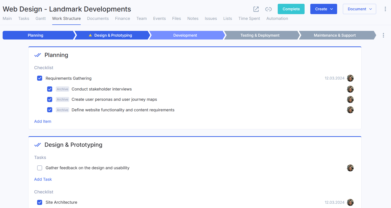 In an individual project, you can add stages, tasks, and checklists via the "Work Structure" tab. In workflow-based projects, only tasks and checklists can be added.