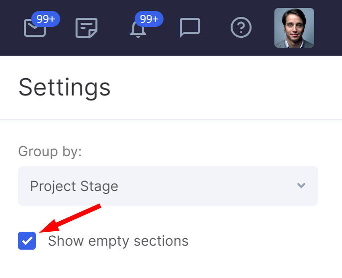 Select "Project Stage" to enable task grouping. If you need to see all the stages of the project, including those that do not have any tasks, check the box "Show empty sections".