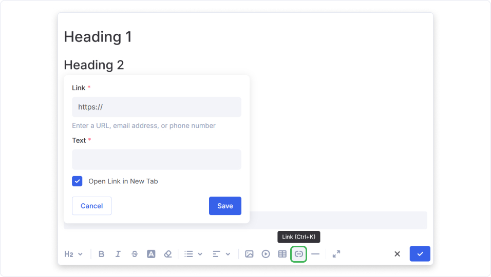 To create a hyperlink, highlight your text and select the chain icon to attach a web address.