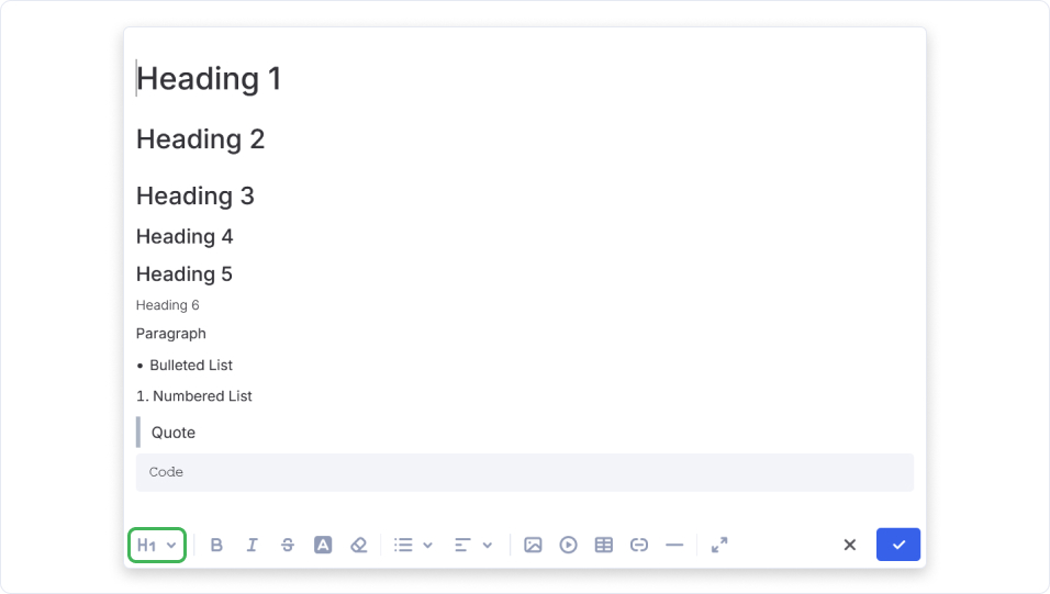 Headings (H1–H6), and some special format like quote and code. Adjacent to this, you will find