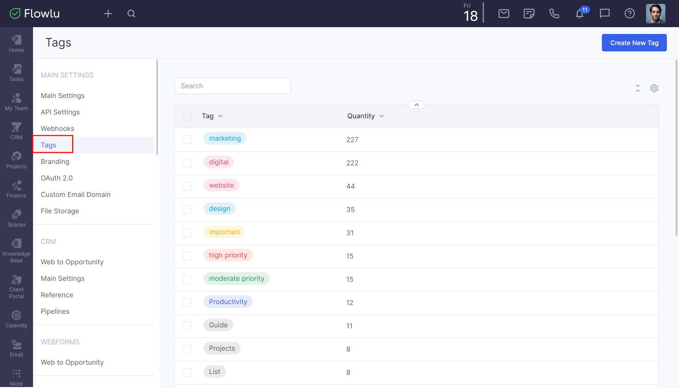 In Flowlu, you can tag tasks, projects, contacts, organizations, products and services, Agile issues, knowledge base articles. With tags, you can filter your data and easily find the right information.