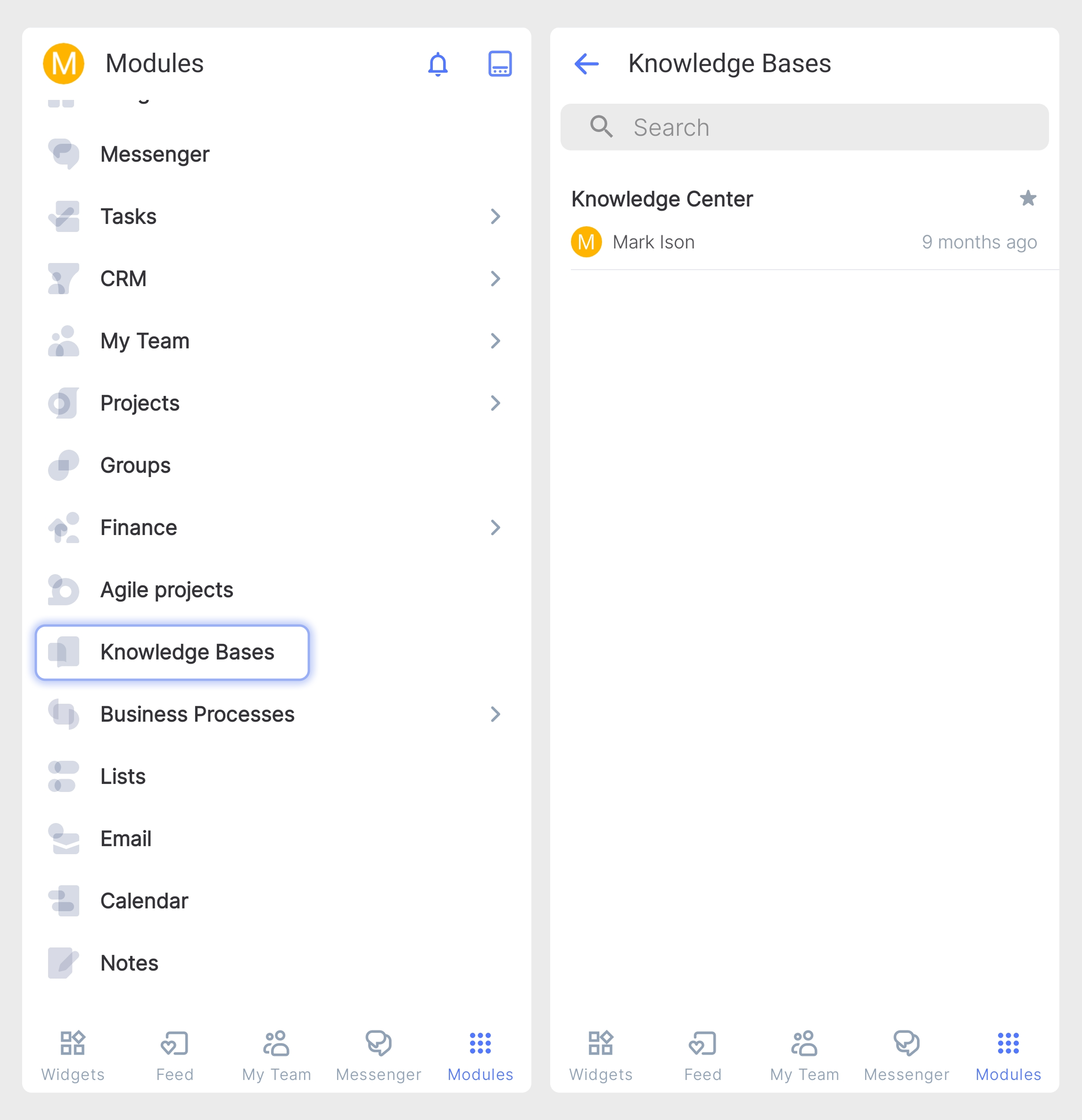 Note: The mobile app is intended for viewing and searching for information. Creating new knowledge bases, writing or editing articles, and managing the structure and permissions must be done using the desktop version of Flowlu.