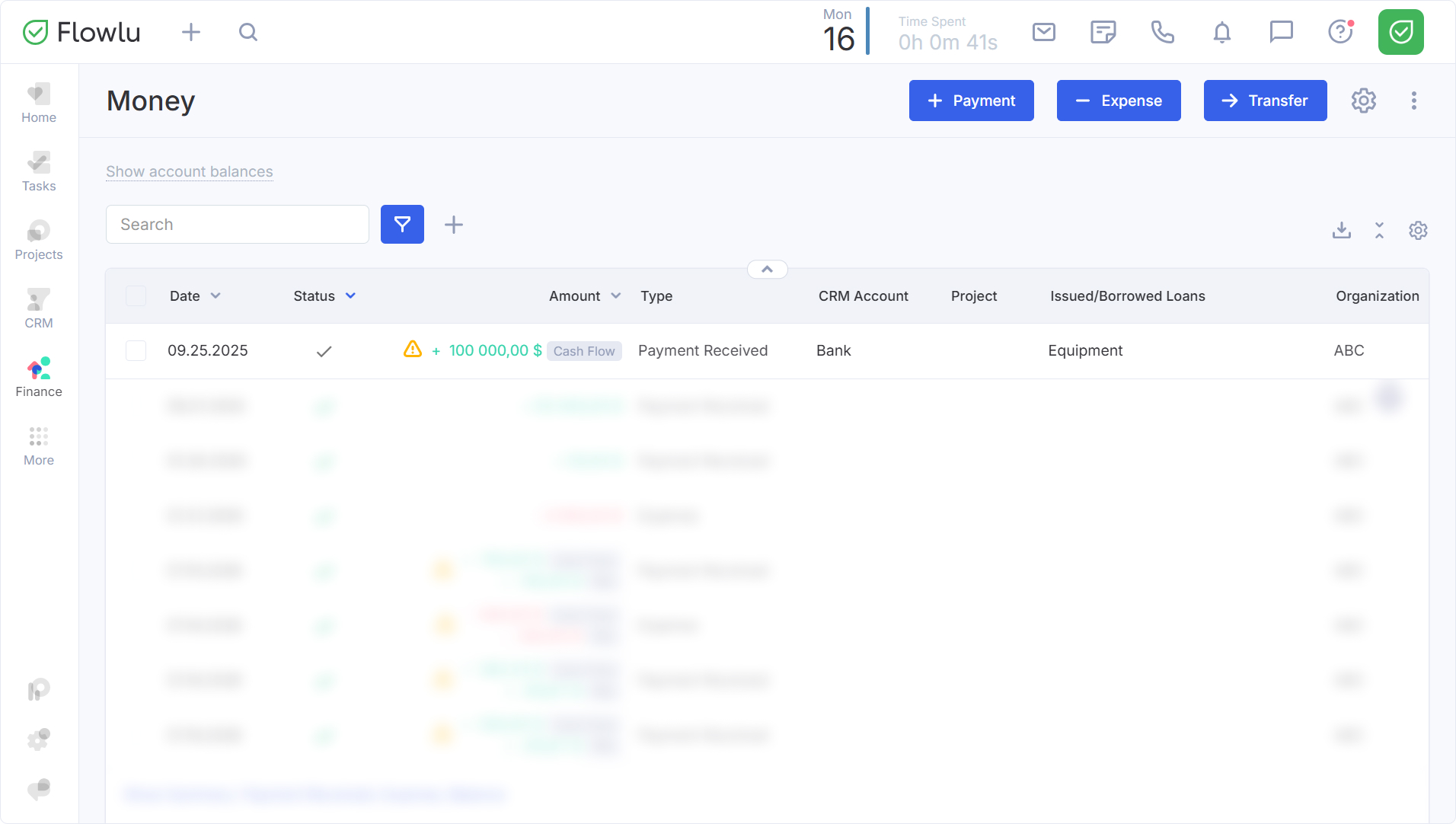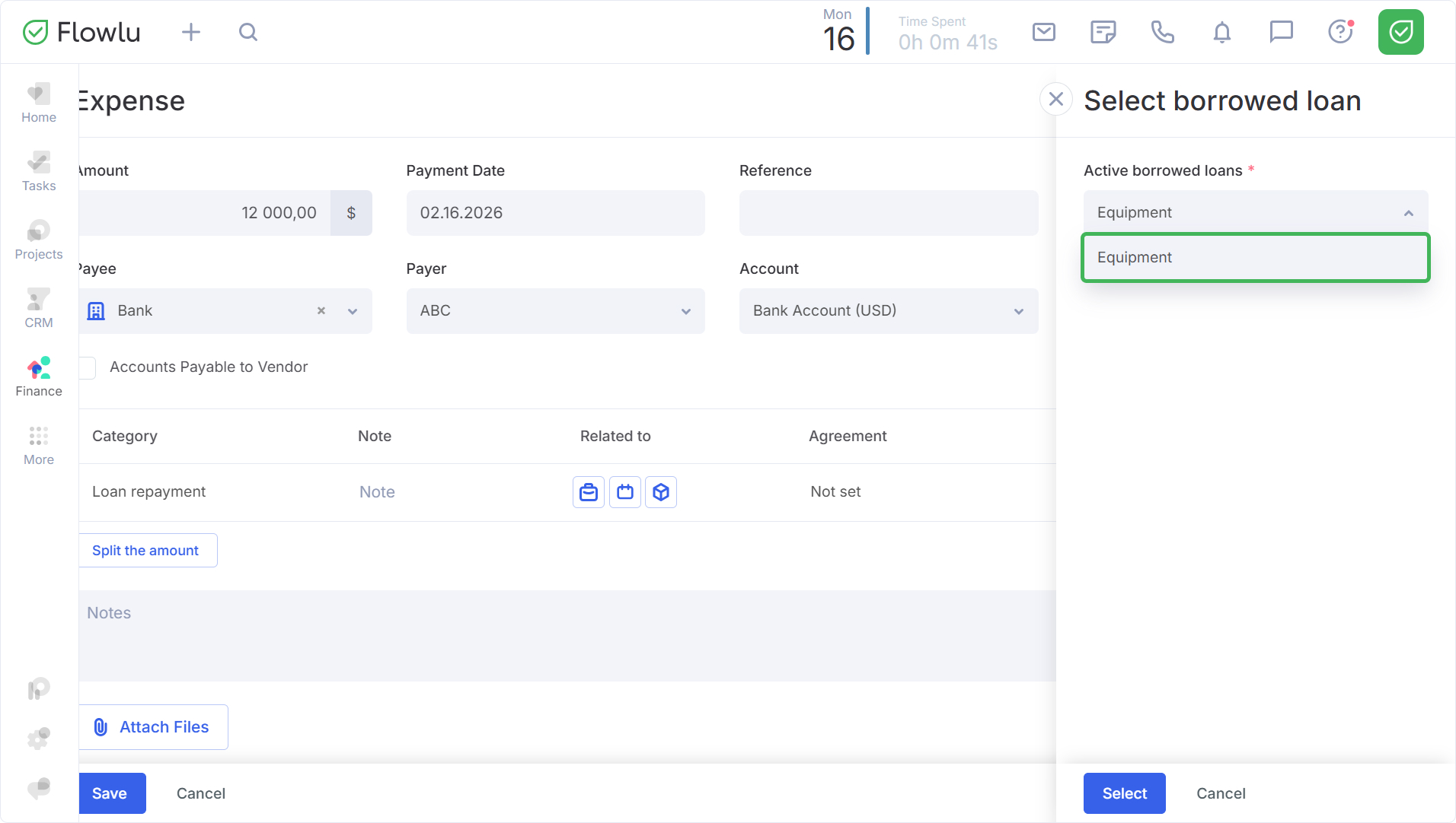 The fact of receiving a loan must also be reflected in your financial documents. To do this, navigate to the Money tab and create a Payment entry, specifying: