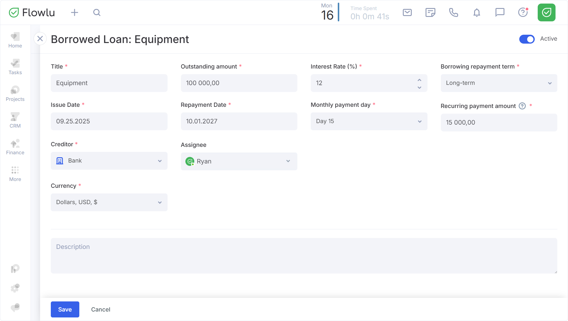 In the loan creation window, fill in the following fields:
