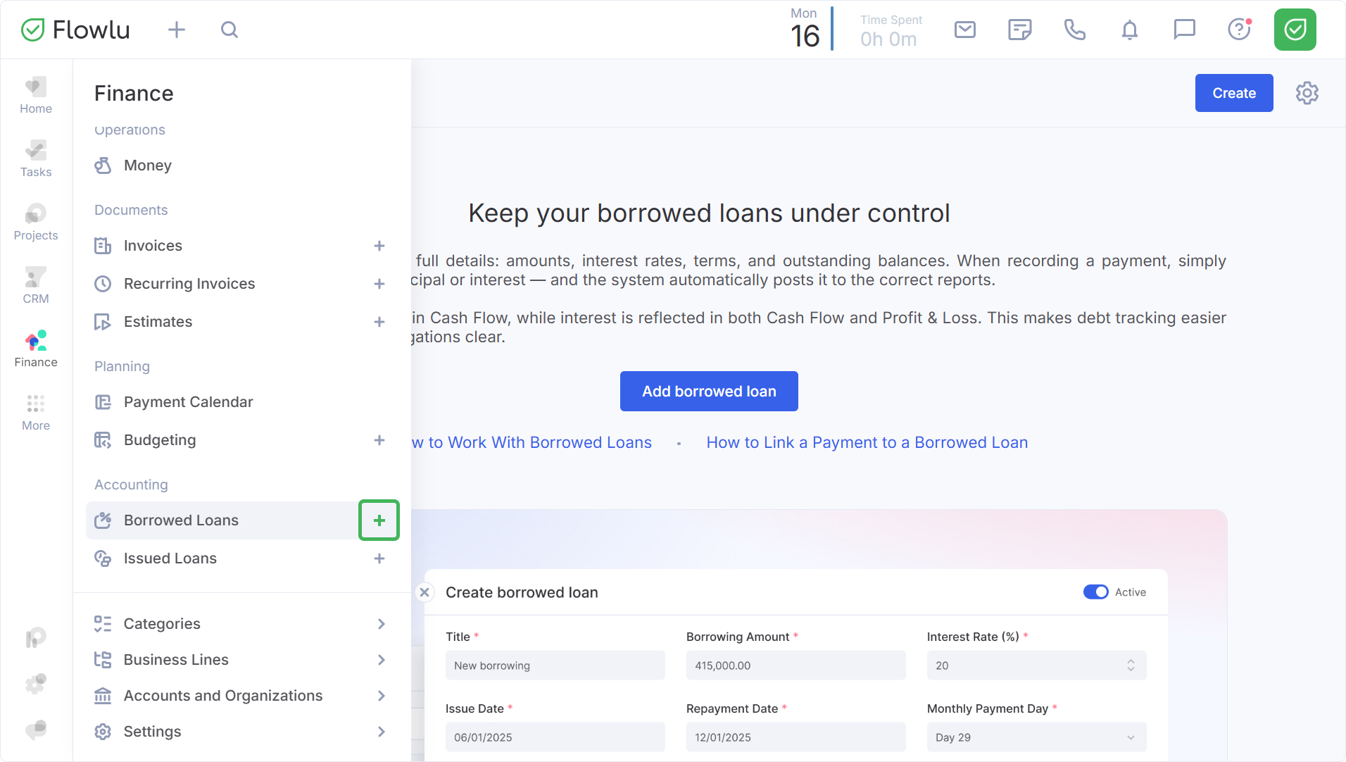 To create a loan through the Finance module menu, go to the Borrowed Loans subsection and click the Create button in the upper right corner.