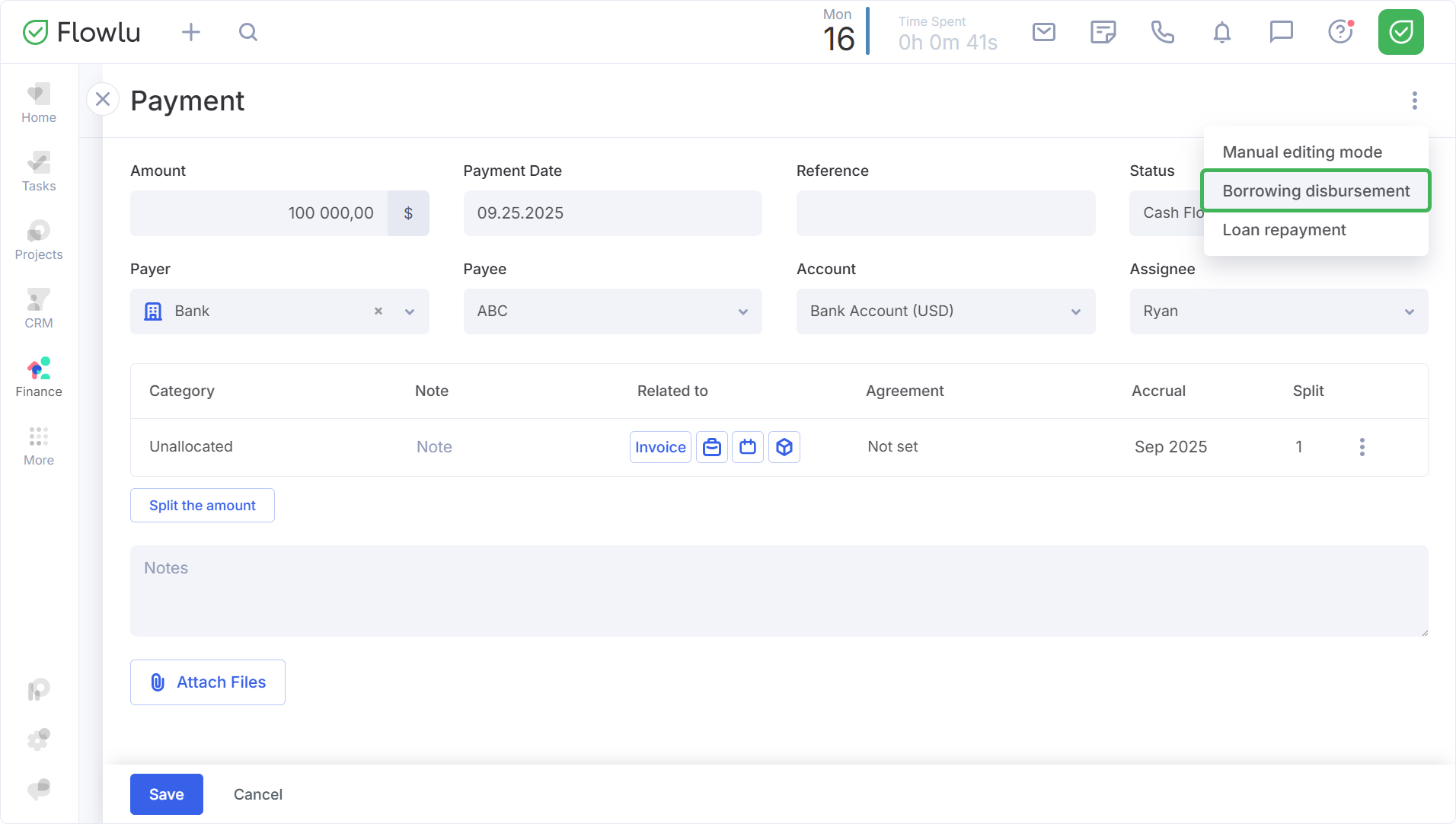 Next, this payment must be linked to an entity from the Loans module. To do this, in the payment edit window, open the context menu and select the "Borrowing disbursement" option.