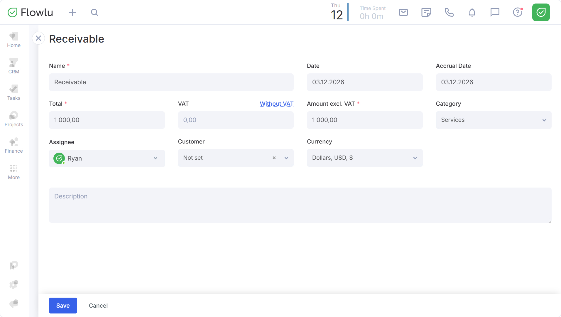 You can only add an entity within the module. To create one, click the corresponding button in the top right corner of the screen and select the type you want to add — Receivable or Payable.