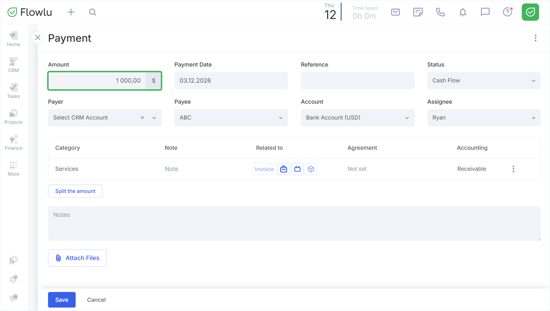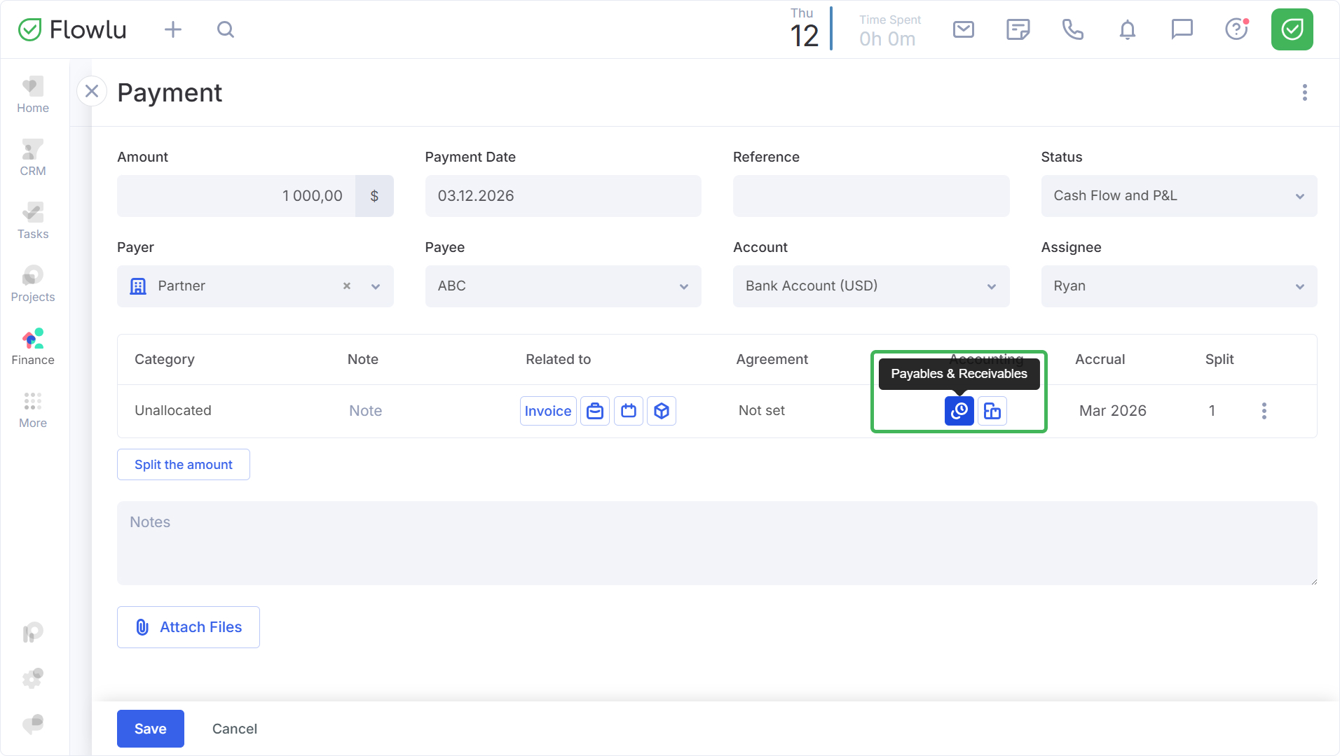 Next, fill in the payment details as usual. Then, in the Category settings, click the button in the Accounting column.