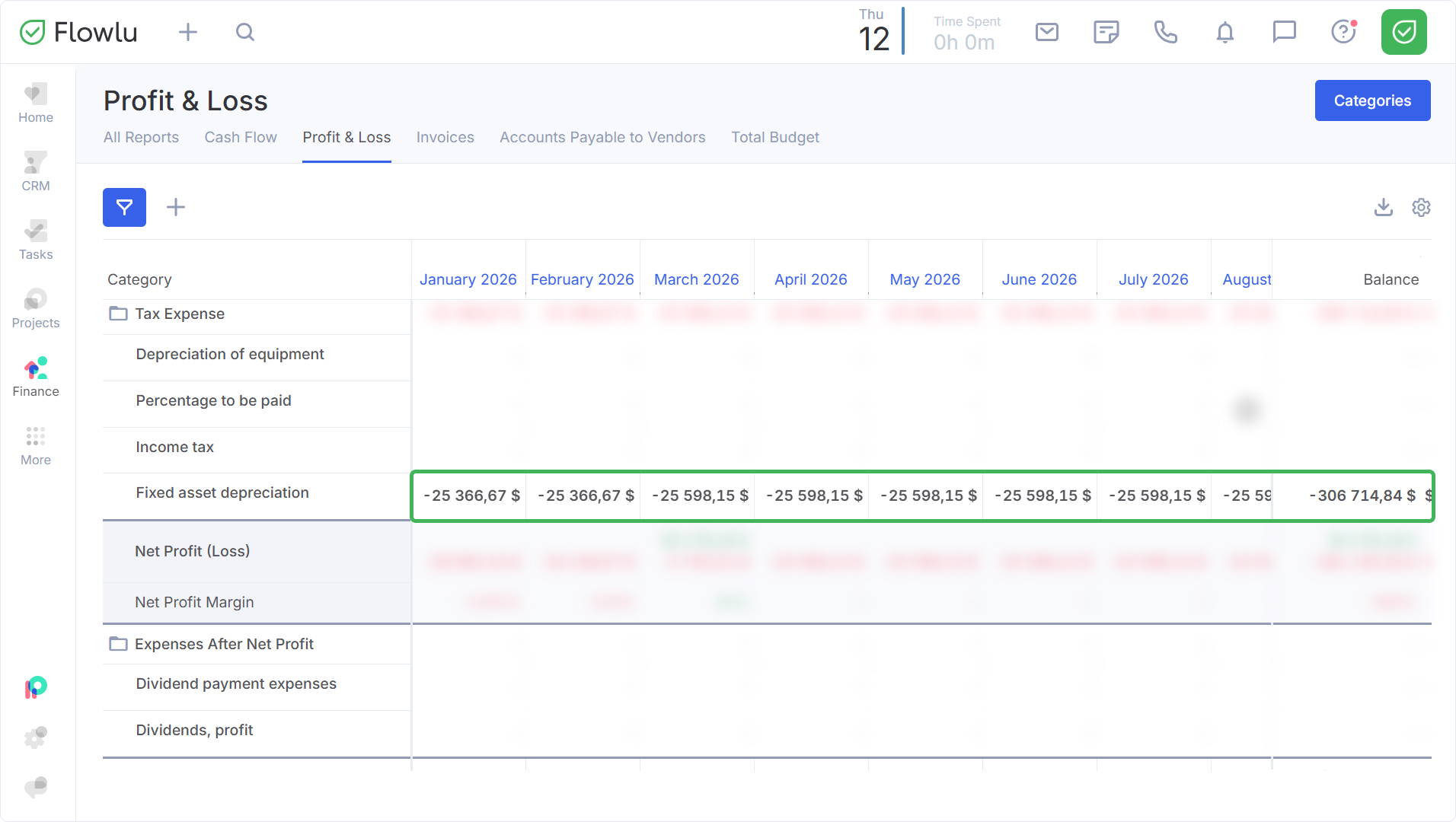 In the Fixed Assets module, when adding assets, you can immediately specify the depreciation amount and period. Depreciation expenses will be reflected in the P&L report.