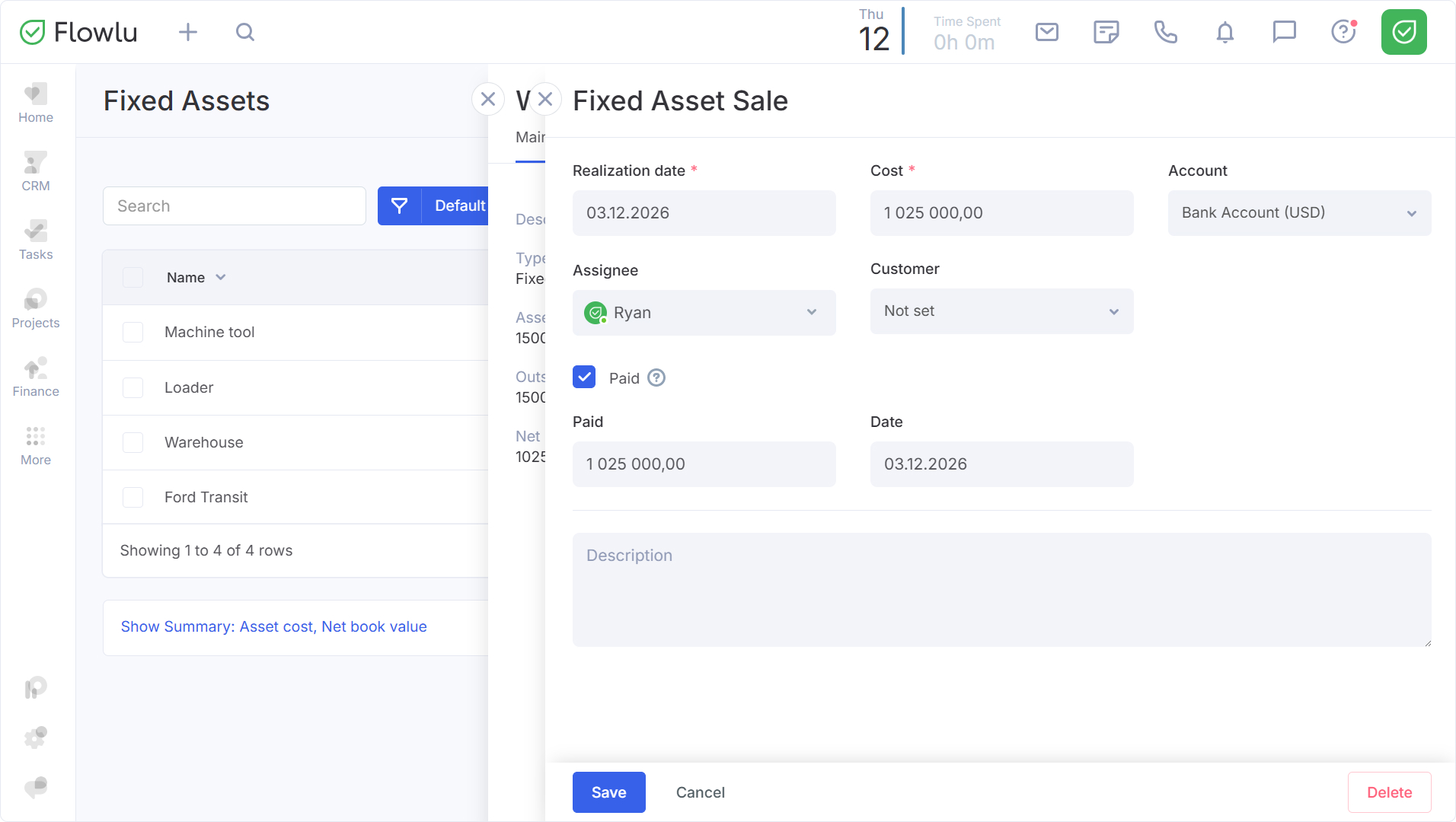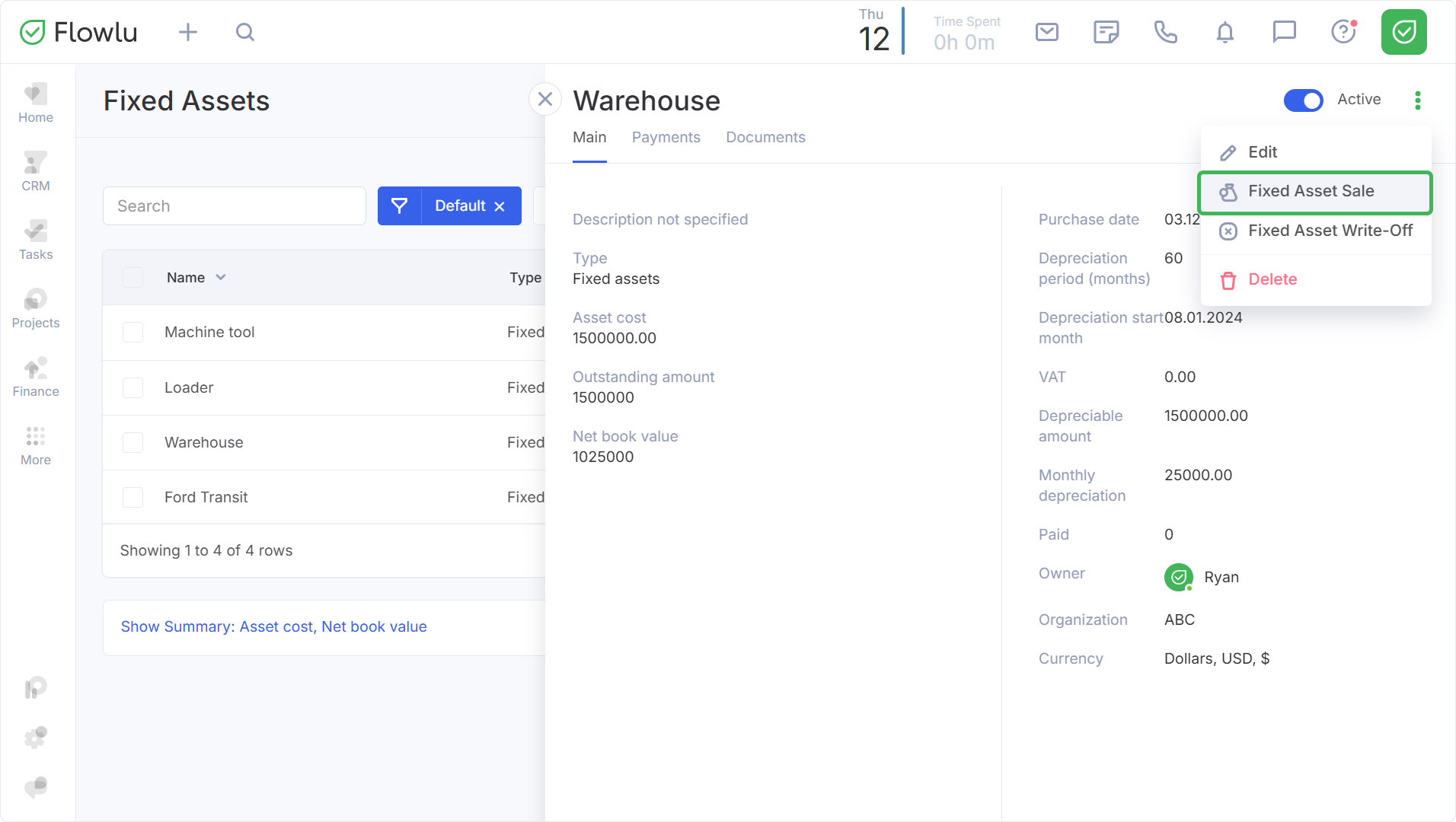 To sell an asset, open the context menu in the top right corner of its card and select the Fixed Asset Sale option.