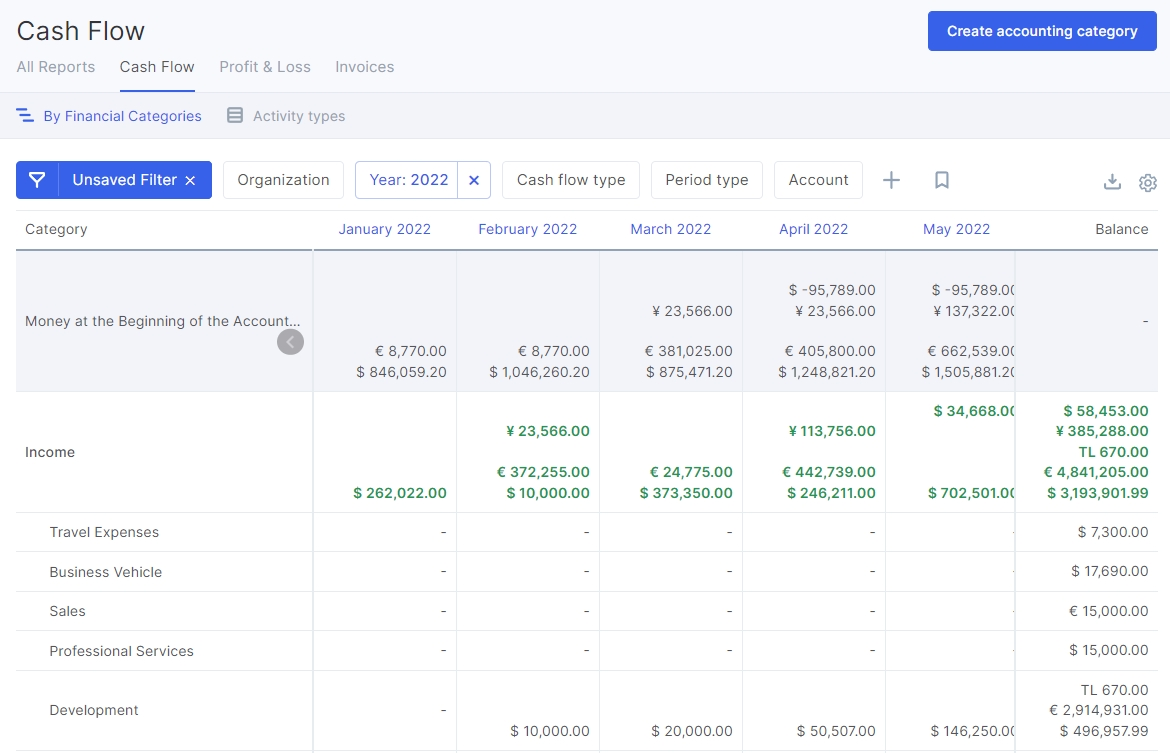 You can also filter the budget by organizations, year, time span, and bank accounts.
