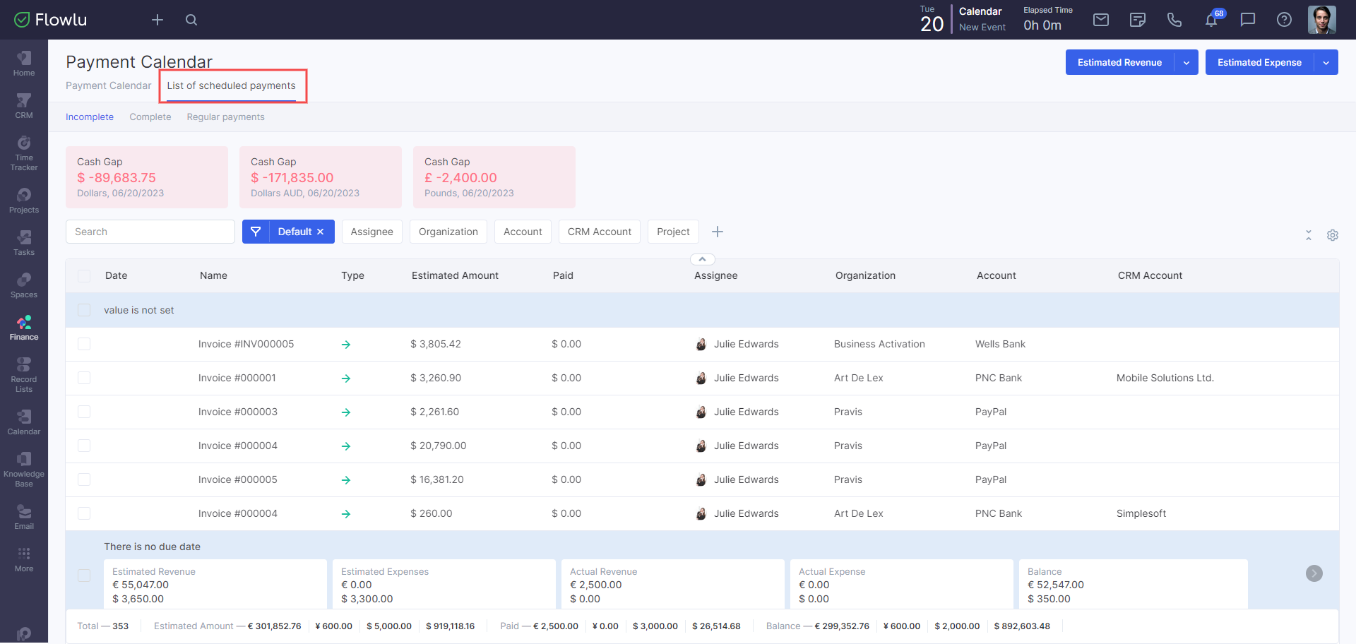 In Flowlu, the cash gap is shown for the upcoming day and marked as red. In case some of the planned revenues or expenses are not met, they'll be transferred to the next day and included in the cash gap. This action will repeat until the planned transaction is not marked as paid, linked to an actual transaction, or simply closed.