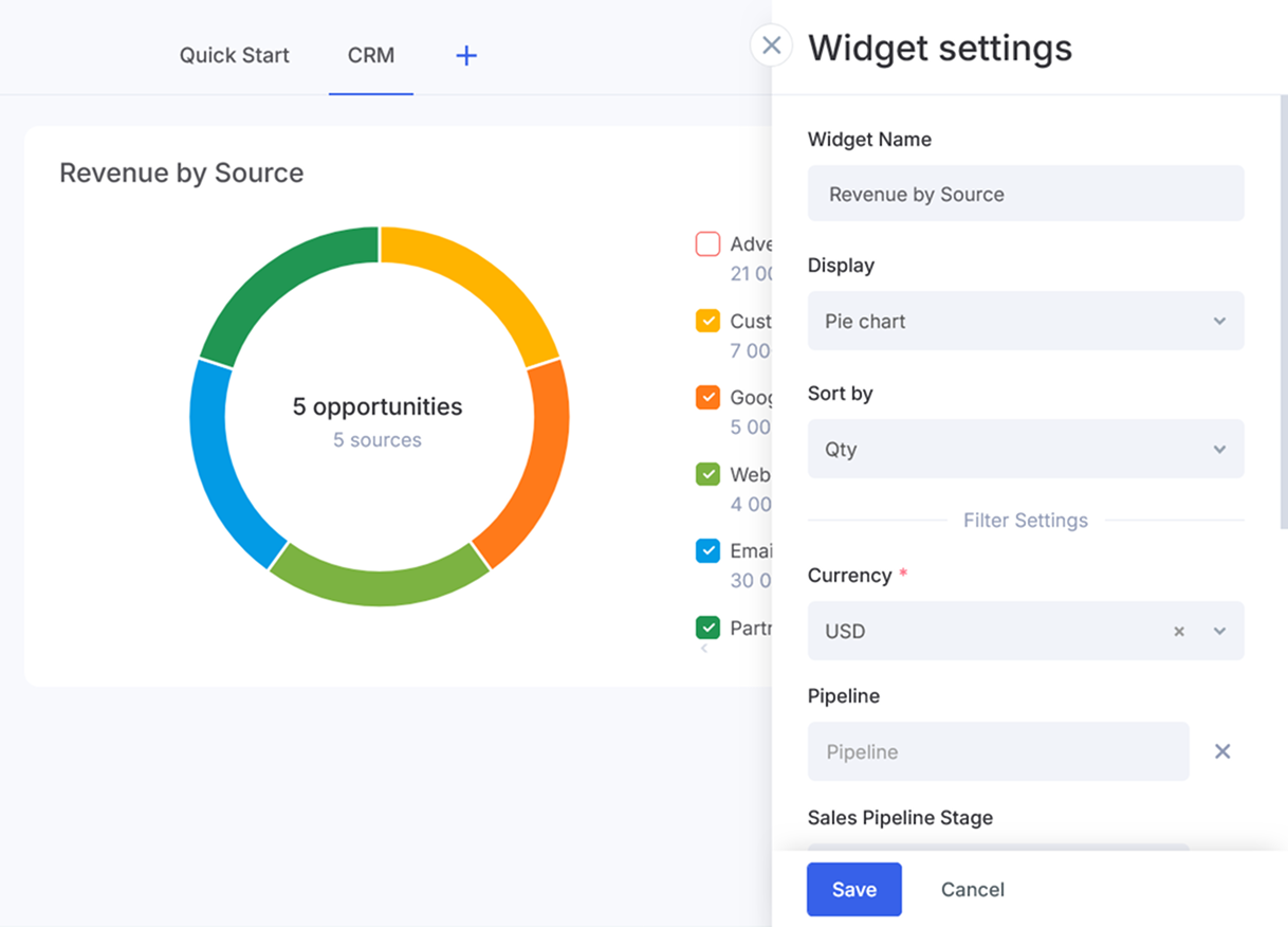 The "Revenue by Source" widget summarizes opportunity information and categorizes it by sources. The widget displays the following information: