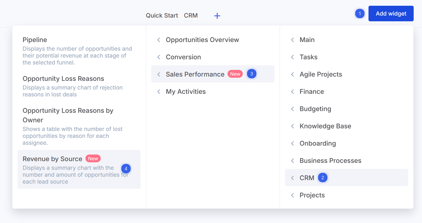 - To find the widget, click the Add Widget button (1), go to the CRM tab (2), select the Sales Performance section (3), and choose Revenue by Source (4) from the list.