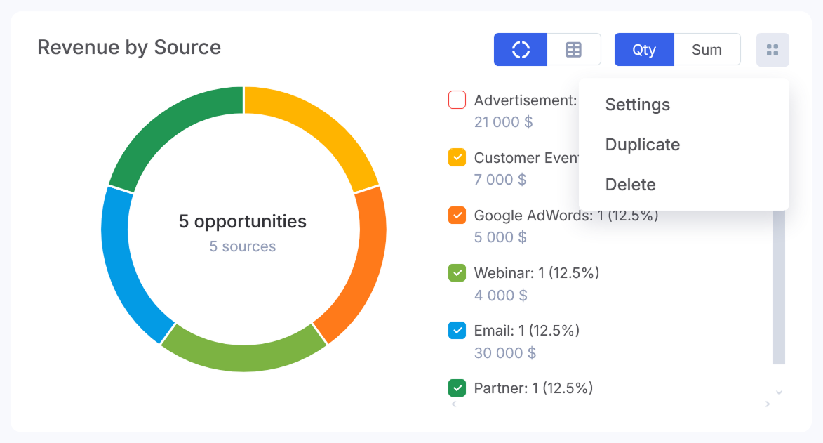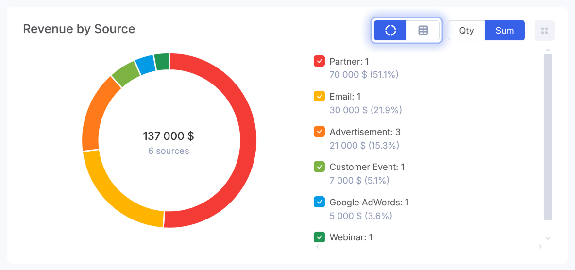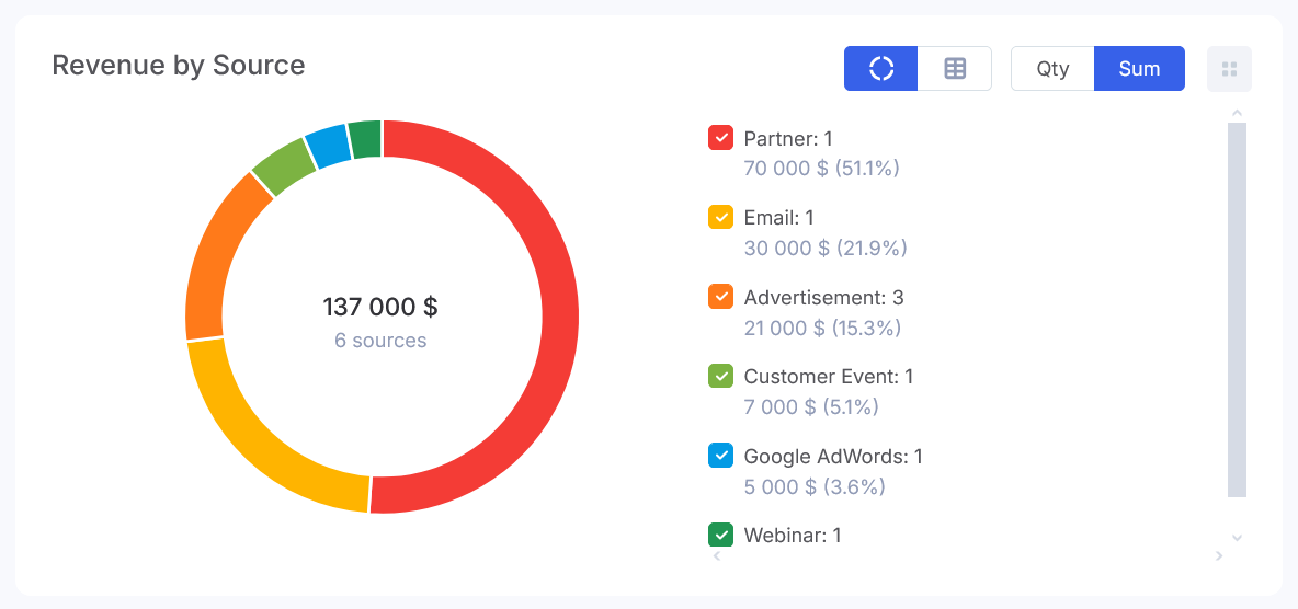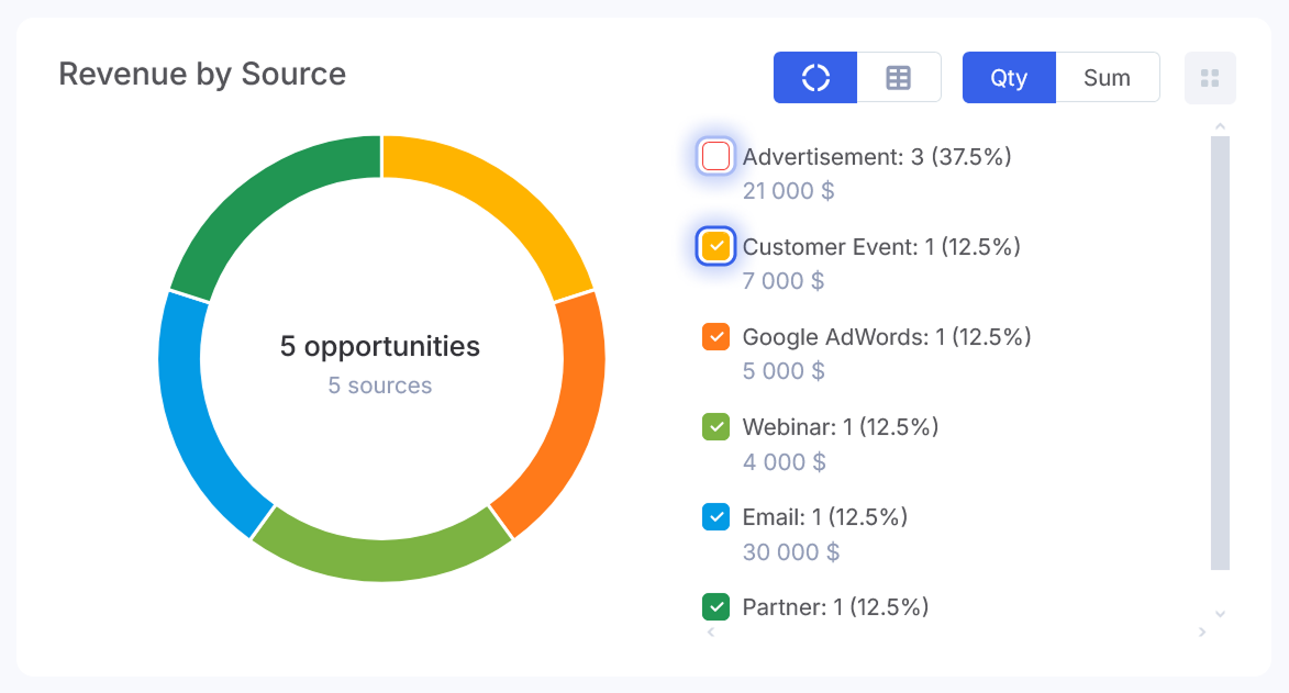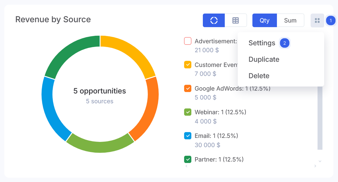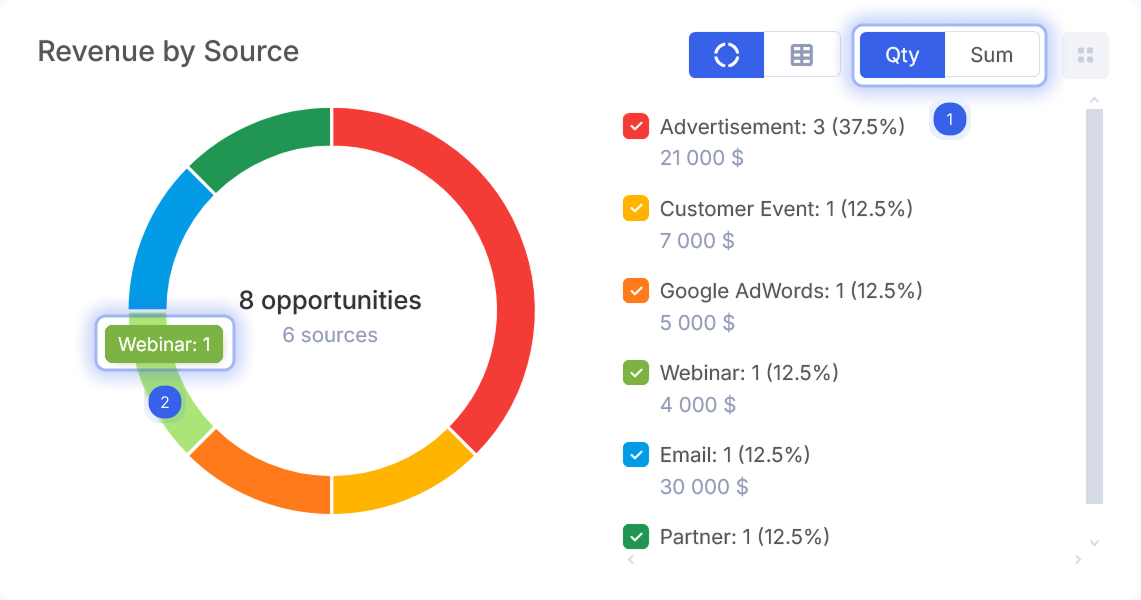 In the chart view, you can switch the data display between Qty. (number of opportunities) and Sum (their total value) (1). When you hover over a chart segment, you will see the number or value of opportunities from the corresponding source (2).