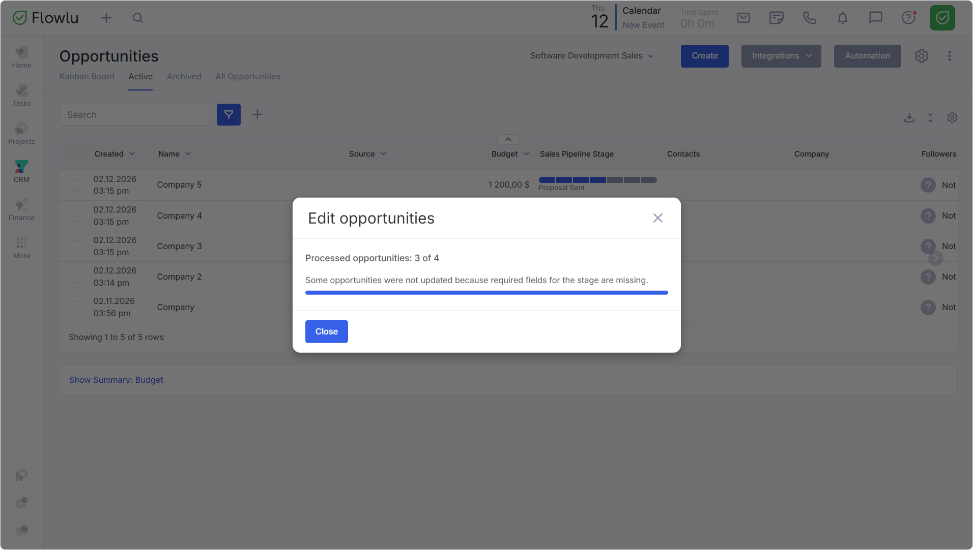 The system also enforces validation during mass actions. If you select multiple opportunities to move them to a new stage, Flowlu will check each one for mandatory data.