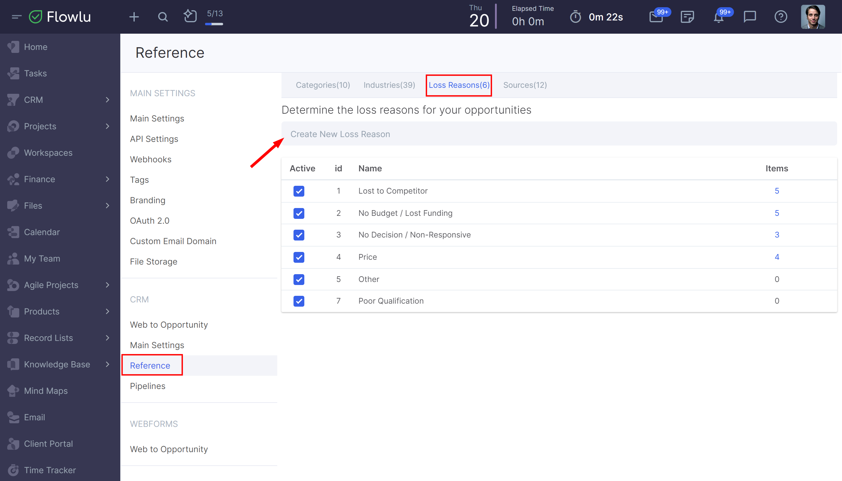 The loss reasons are set in the Portal Settings → CRM → Reference → Loss reasons → Create loss reasons.